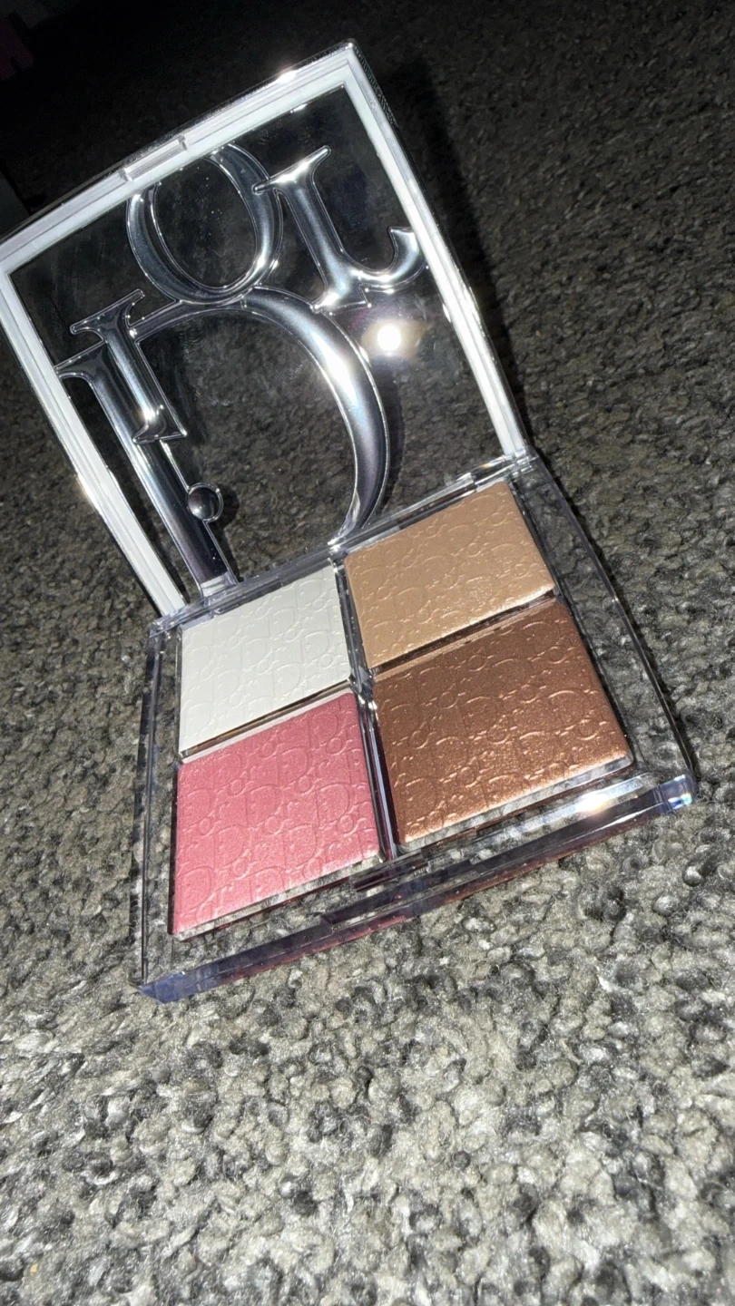 This is a Dior palette with four distinct colors. It includes a shimmery white, a bronzy gold, a rosy pink, and a copper shade. The compact case features a mirrored lid with the Dior logo.