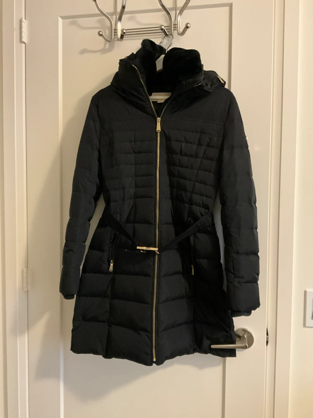 Black Michael Kors puffer coat with gold hardware and a belt. It's a stylish and warm winter jacket. It has a hood for extra protection.