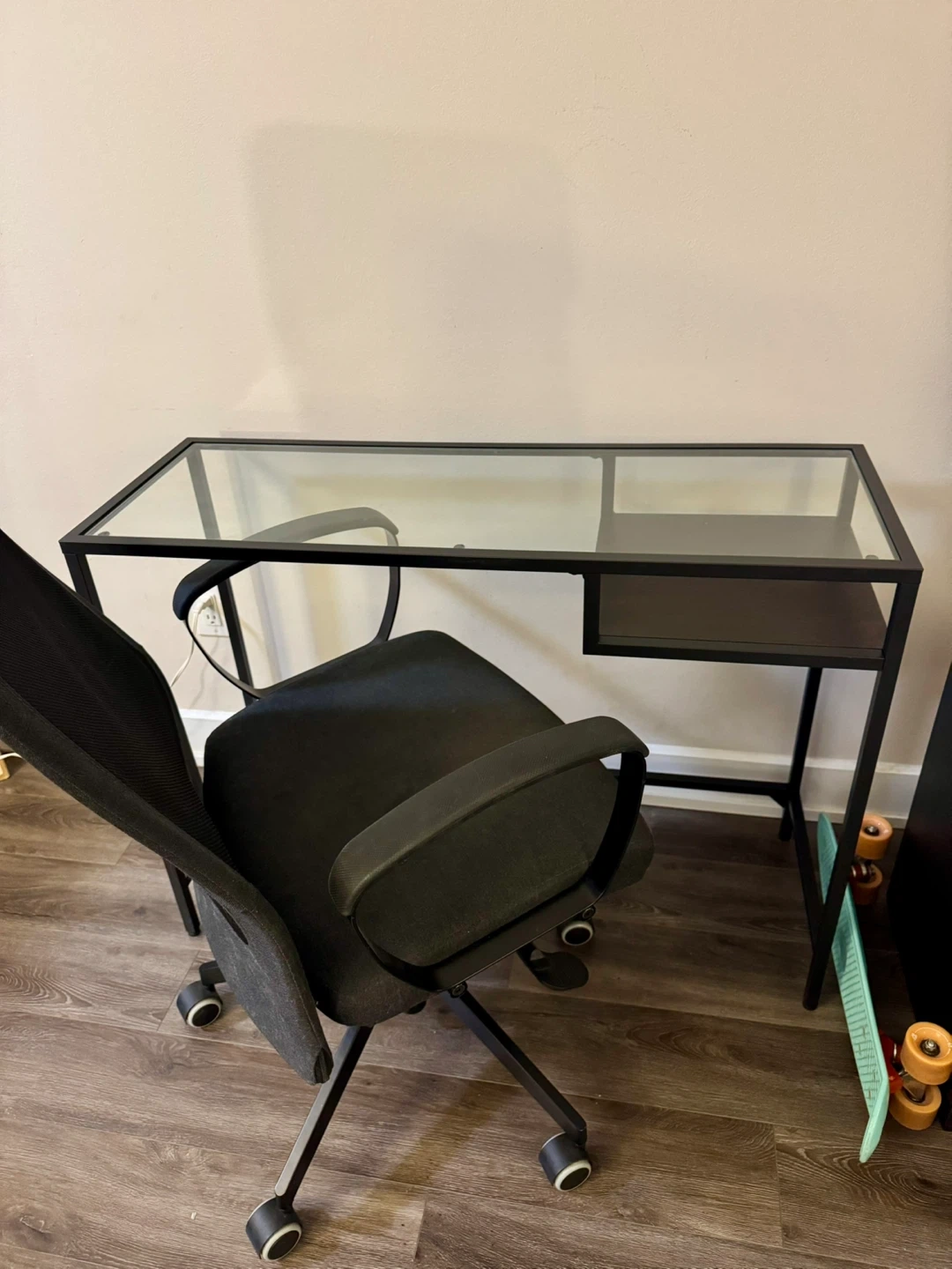 Selling a glass desk with a black metal frame. It comes with a matching office chair. It looks like new. Really great condition.