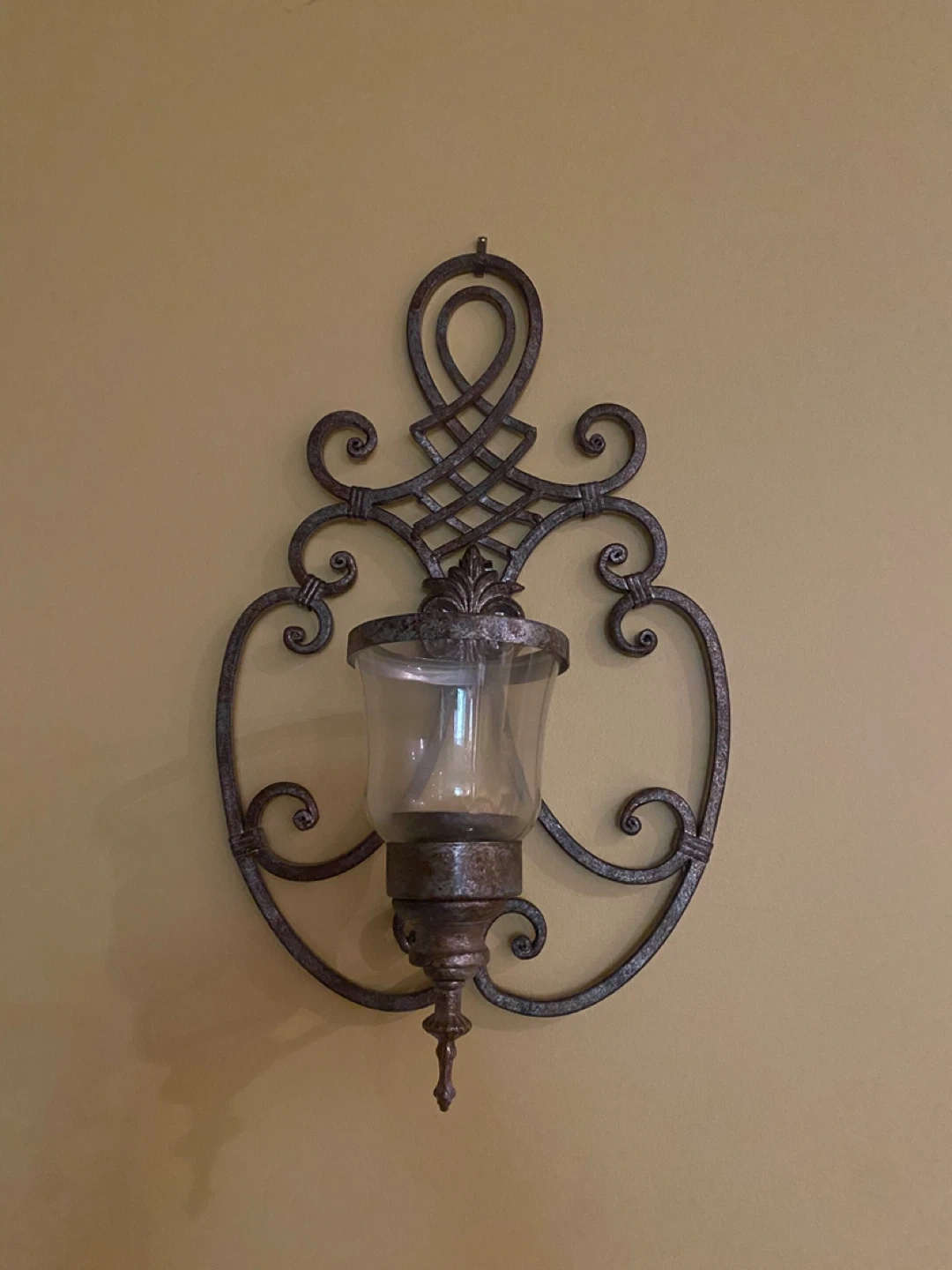 Selling a wrought iron wall sconce with two pair of glass candle holder. It's a beautiful piece to add some vintage charm to any room. It's in great condition and ready to be hung on your wall!