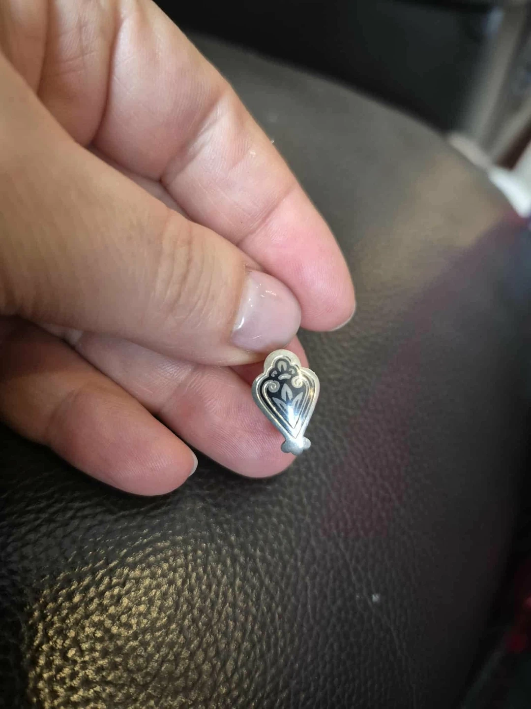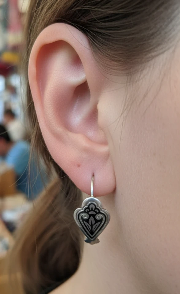 Niello silver dangle earrings with a decorative etched design. They have a hook closure. The design is intricate and classic.