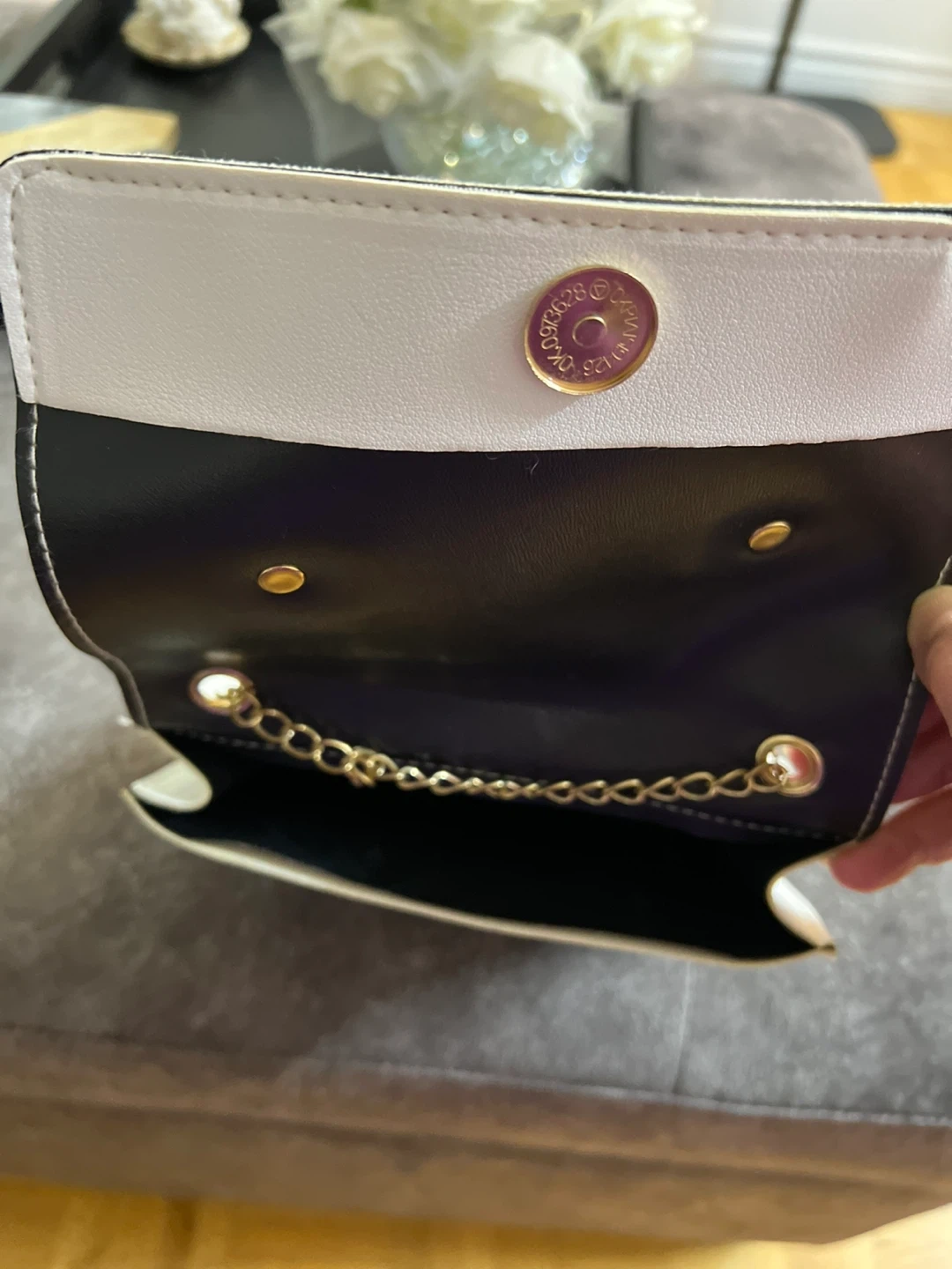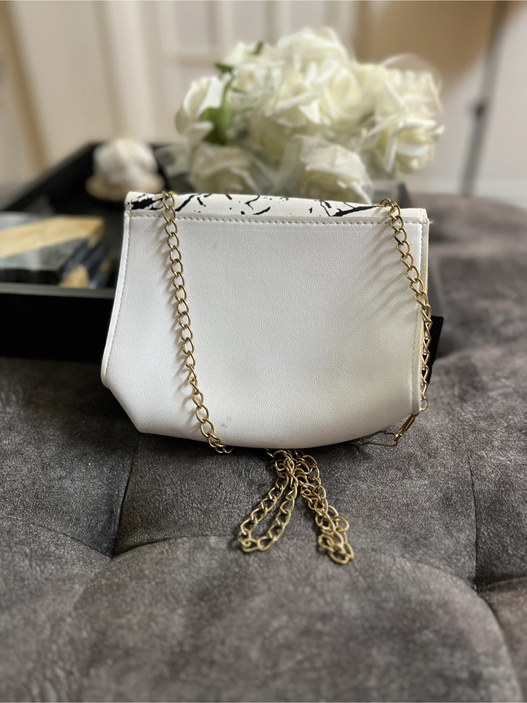 White faux leather purse with a black marble print flap and gold hardware. It's got a stylish chain strap for easy carrying. This compact bag is perfect for essentials on a night out!