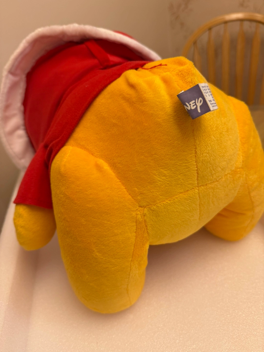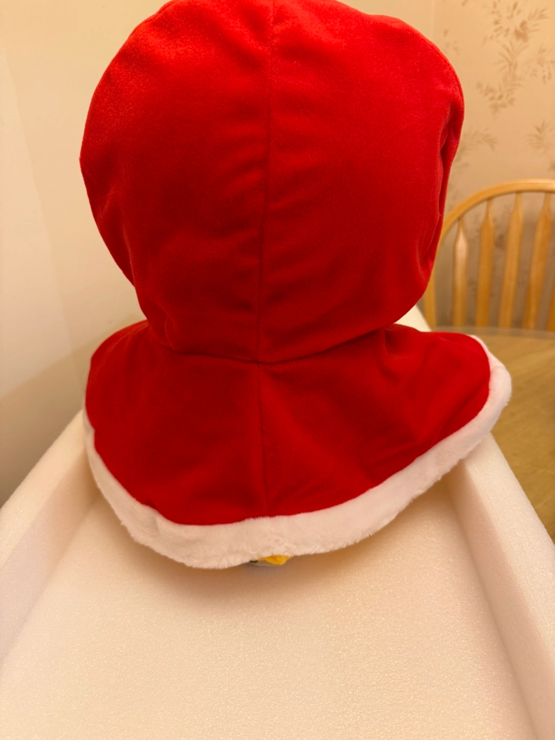 Adorable Winnie the Pooh plush toy. Wearing a red hooded cape with white trim. Perfect Christmas decoration or gift. Soft and cuddly.