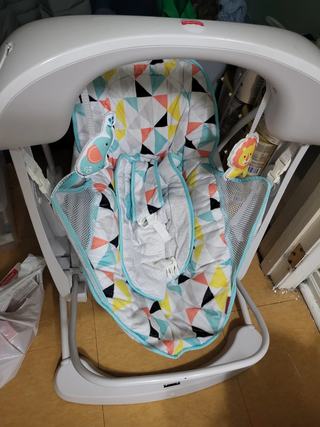 This is a Fisher-Price baby swing with a colourful, geometric print seat. It has plush toys attached for entertainment. The seat fabric is soft and washable.