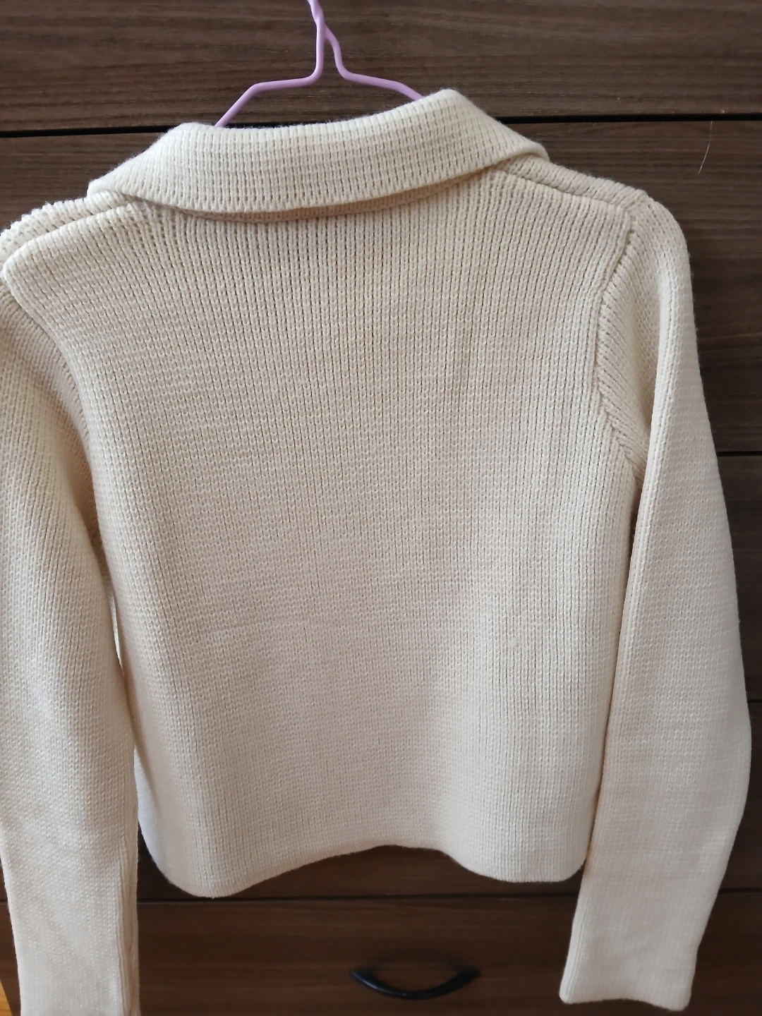 This ZARA knit cardigan is cream colored with a double-breasted button closure. It has a classic collar and two front pockets. Made from a knit material, it offers a cozy feel.