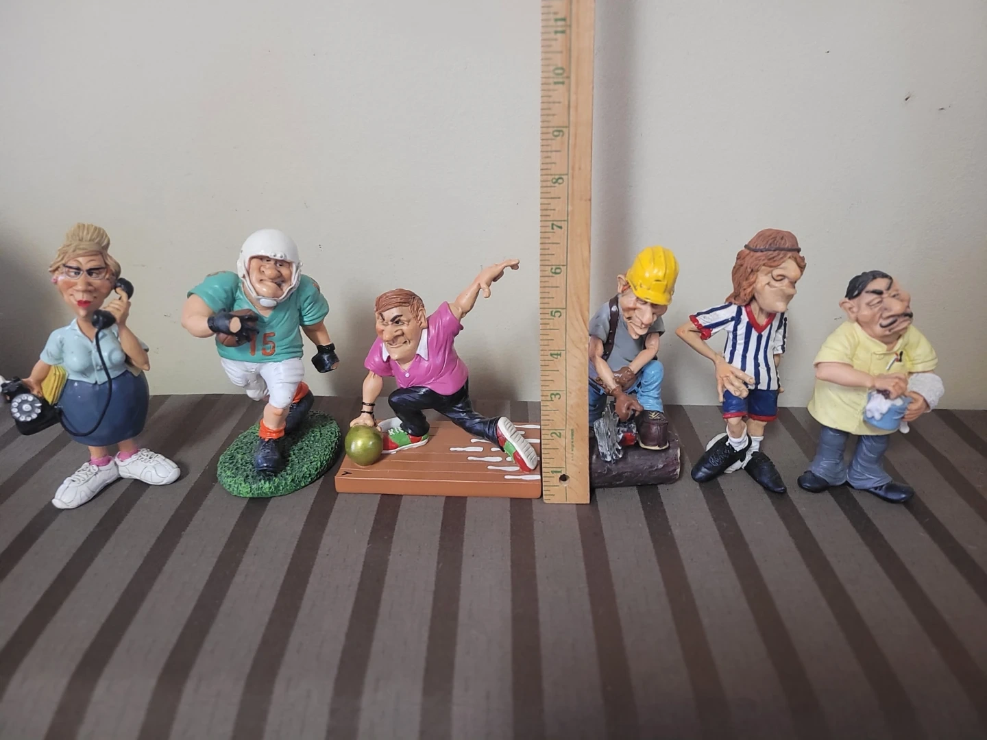 These figurines are part of The Comical World of Stratford collection, designed by artist Warren Stratford, featuring exaggerated, humorous characters in various professions and hobbies.