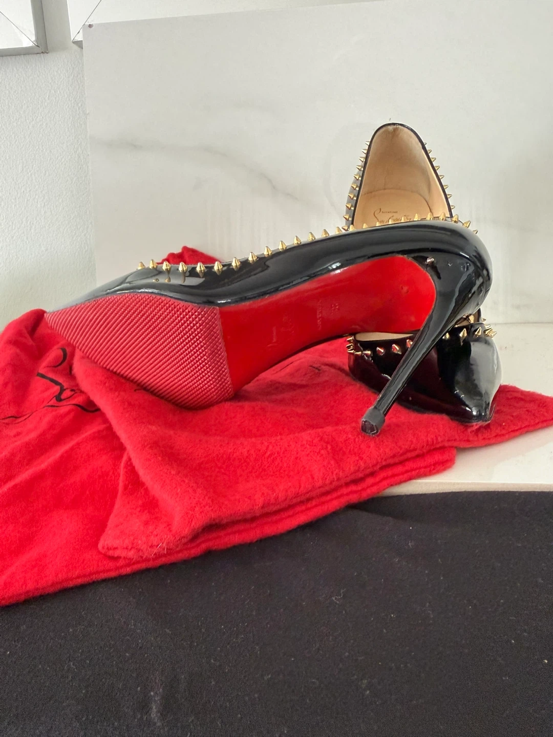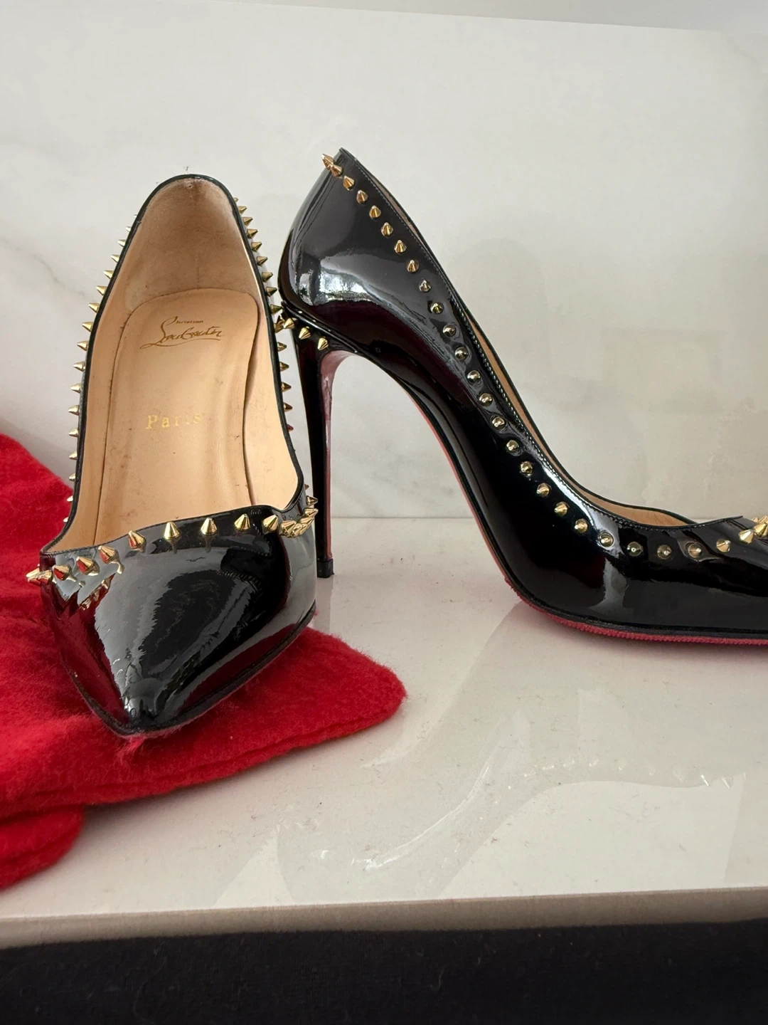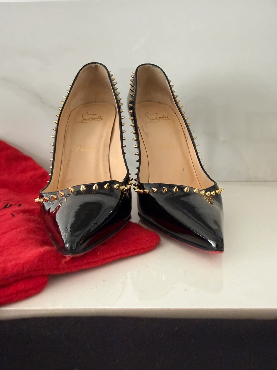 Iconic Christian Louboutin heels in black patent leather. They feature gold-tone spikes and the signature red sole. Includes dust bags.