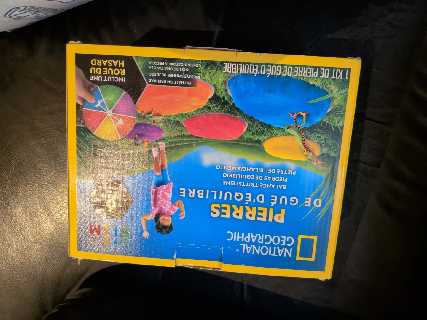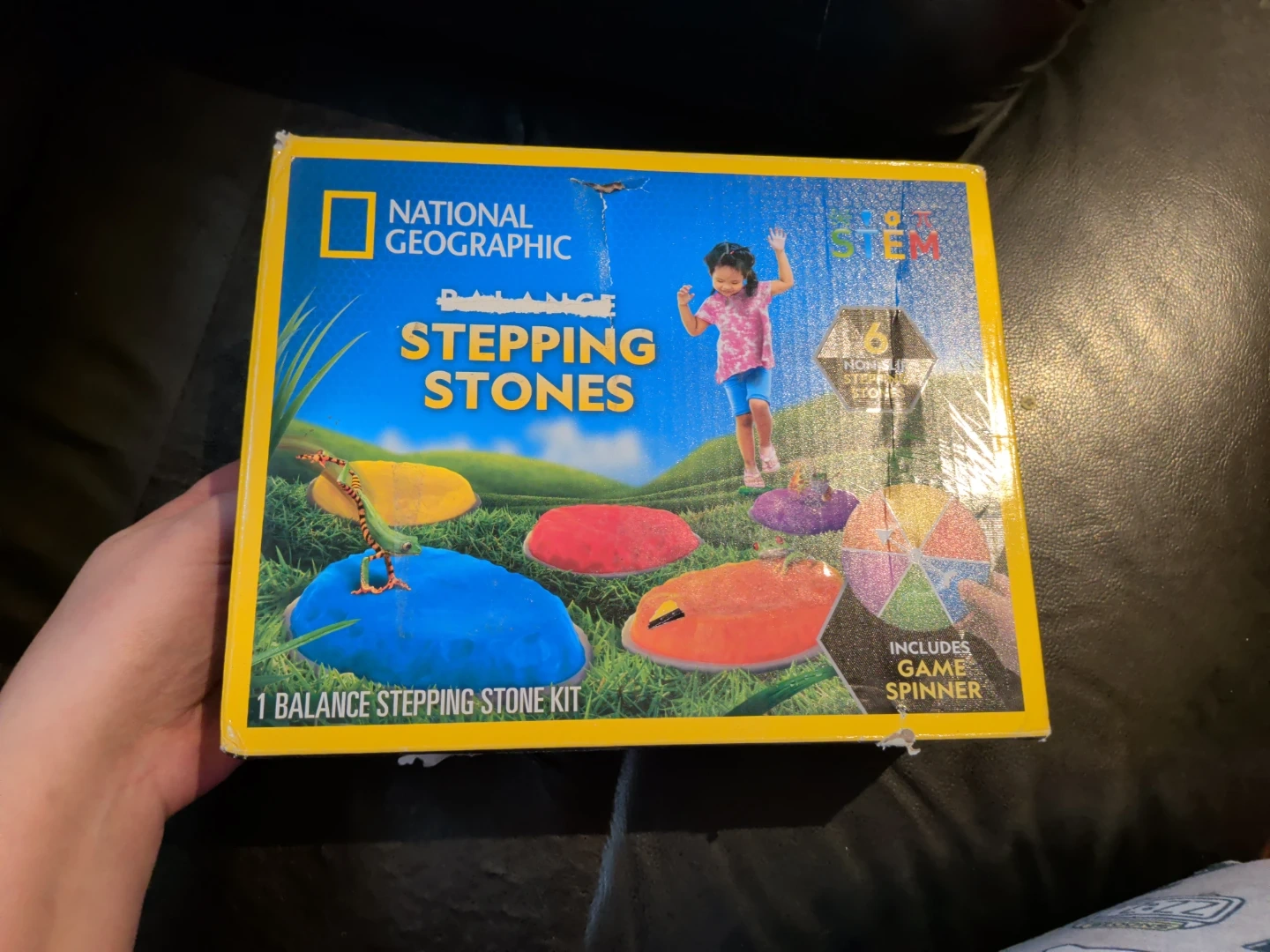 This kit includes 6 non-slip stepping stones and a game spinner with instructions. It's designed for balance and active play. Recommended for ages 3 and up.