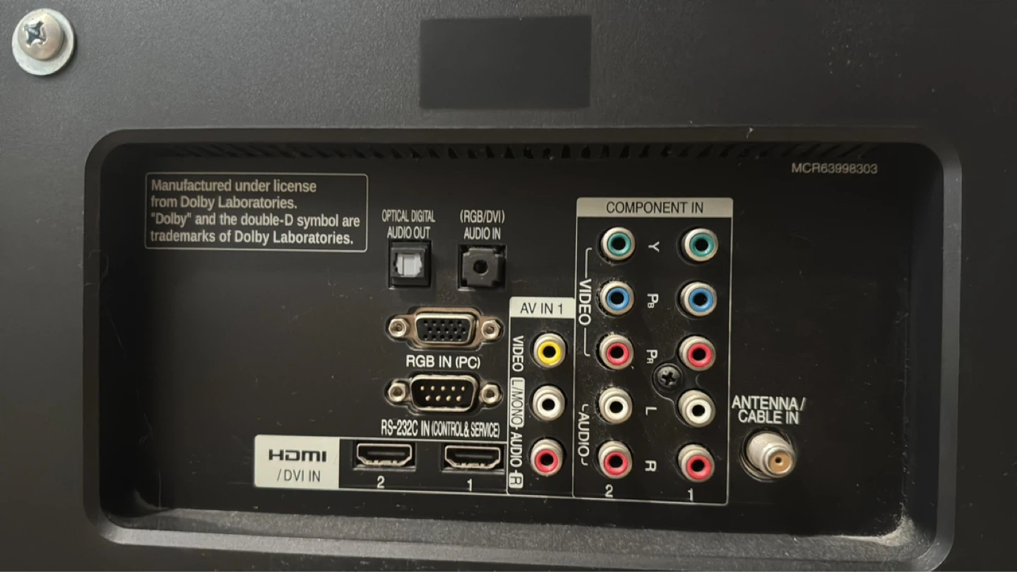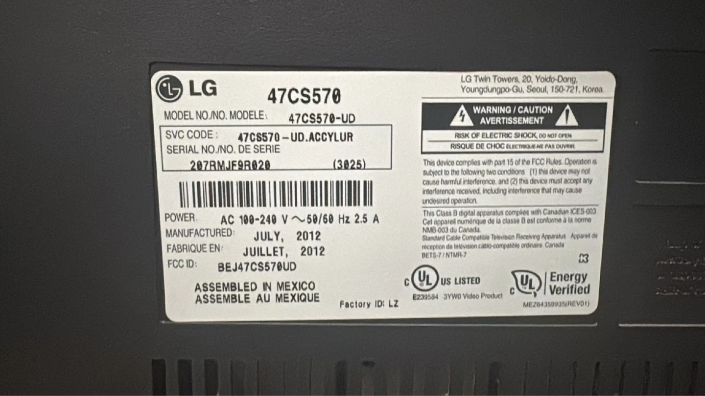 LG 47CS570 47-inch 1080p LCD HDTV manufactured in July 2012. It comes with multiple inputs including HDMI, Component, and AV. A remote is included.