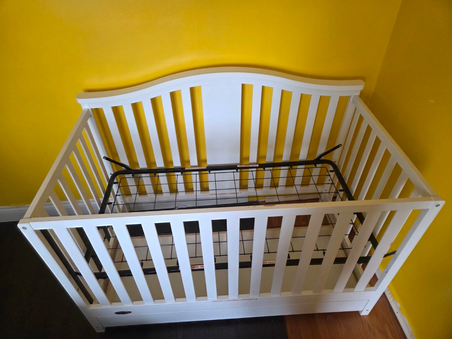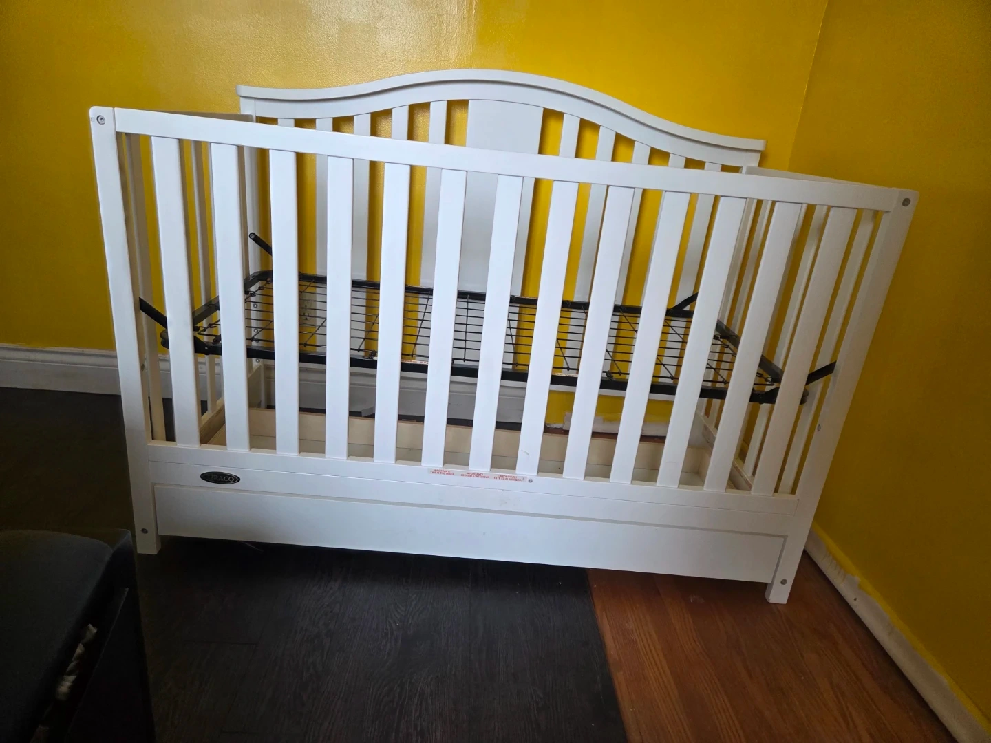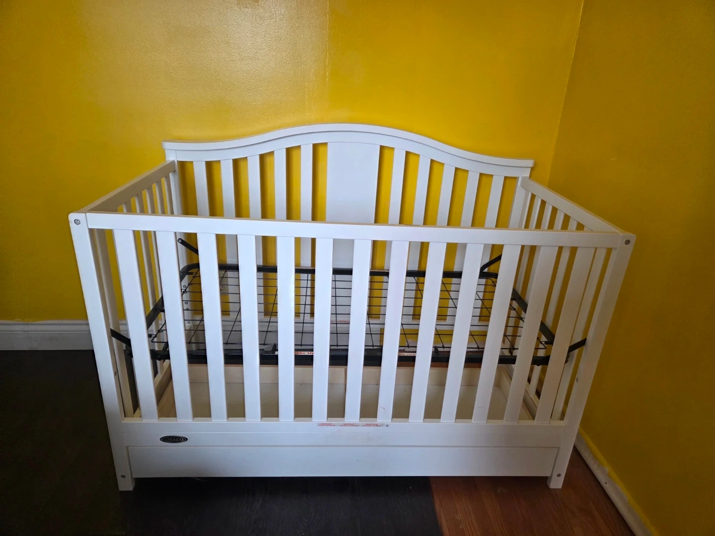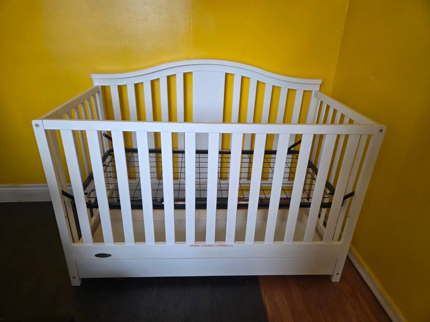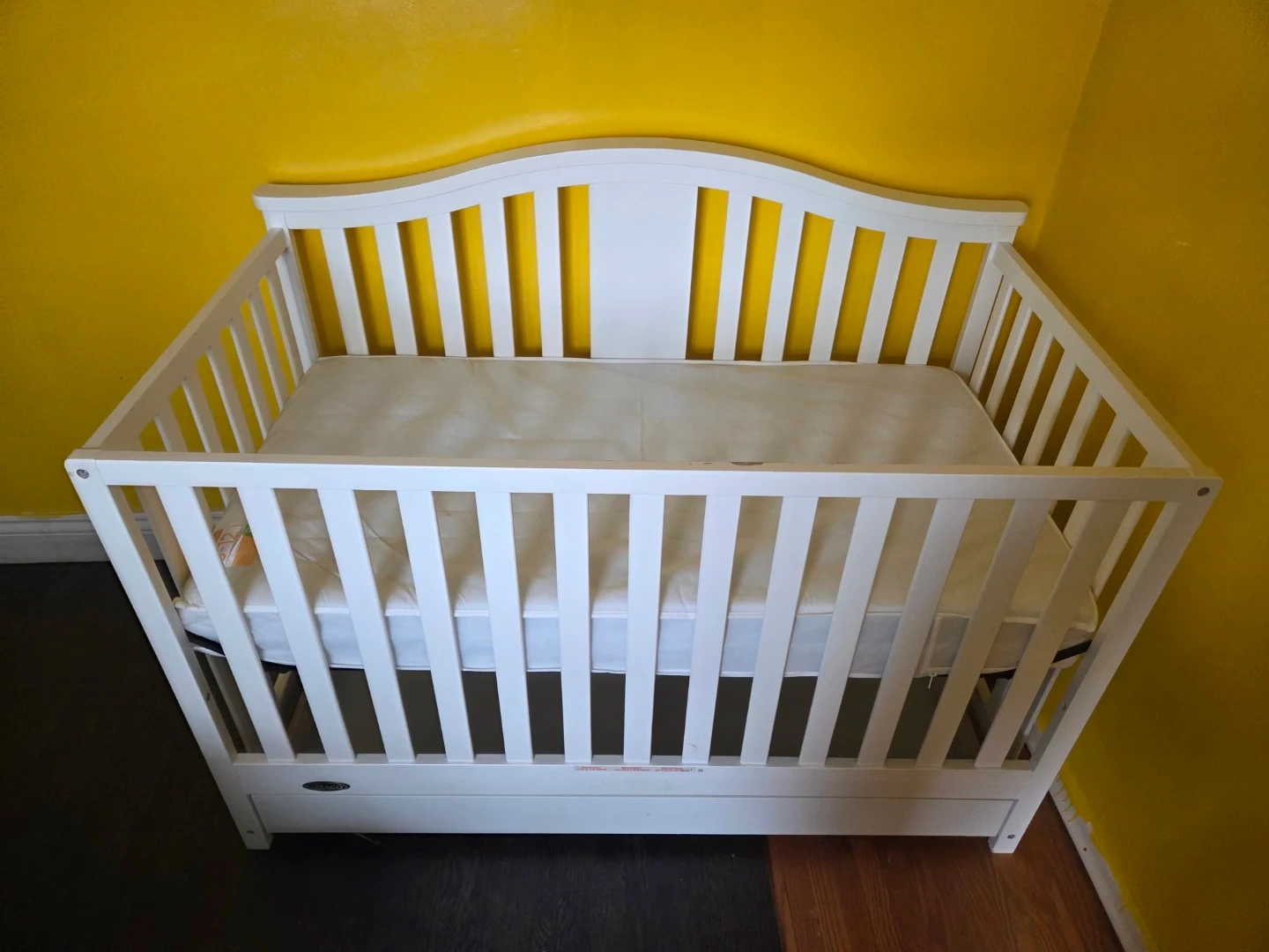 White Graco crib including mattress. It's made of wood and features a drawer for storage underneath. Cribs are essential for infant safety and sleep.
