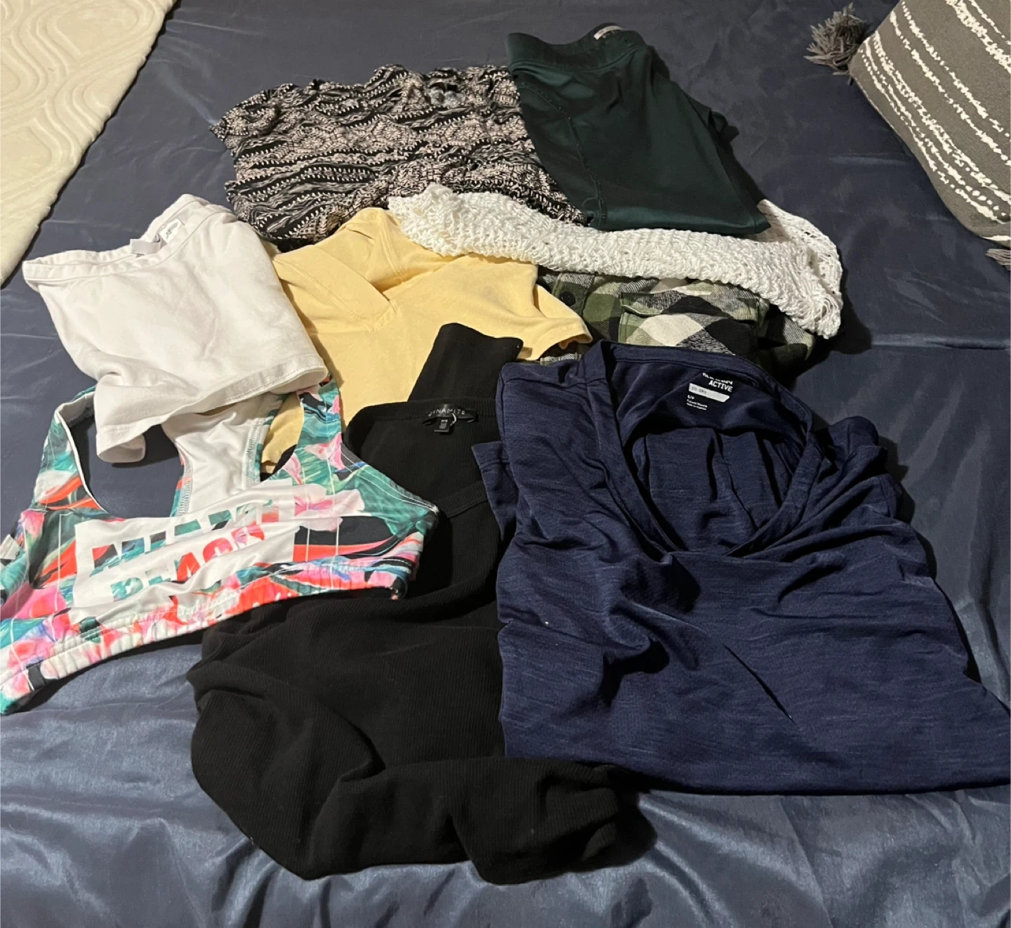 Selling a mixed lot of clothing items. The lot includes a sports bra with a Miami Beach design, a long-sleeved Old Navy top, and several other tops in various styles and colours