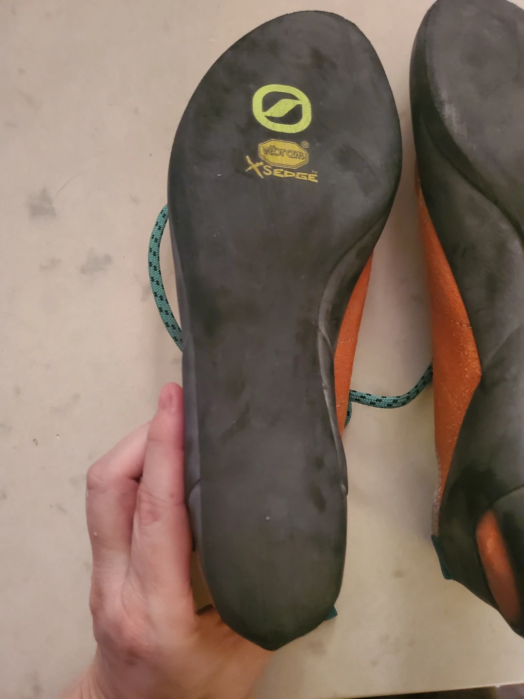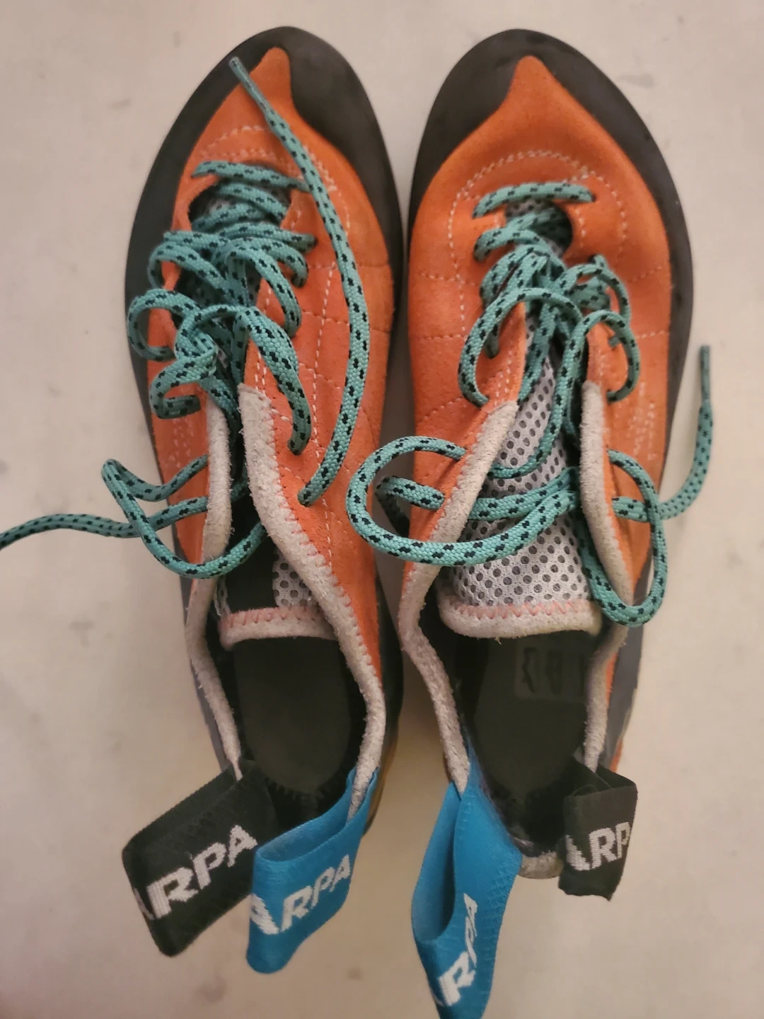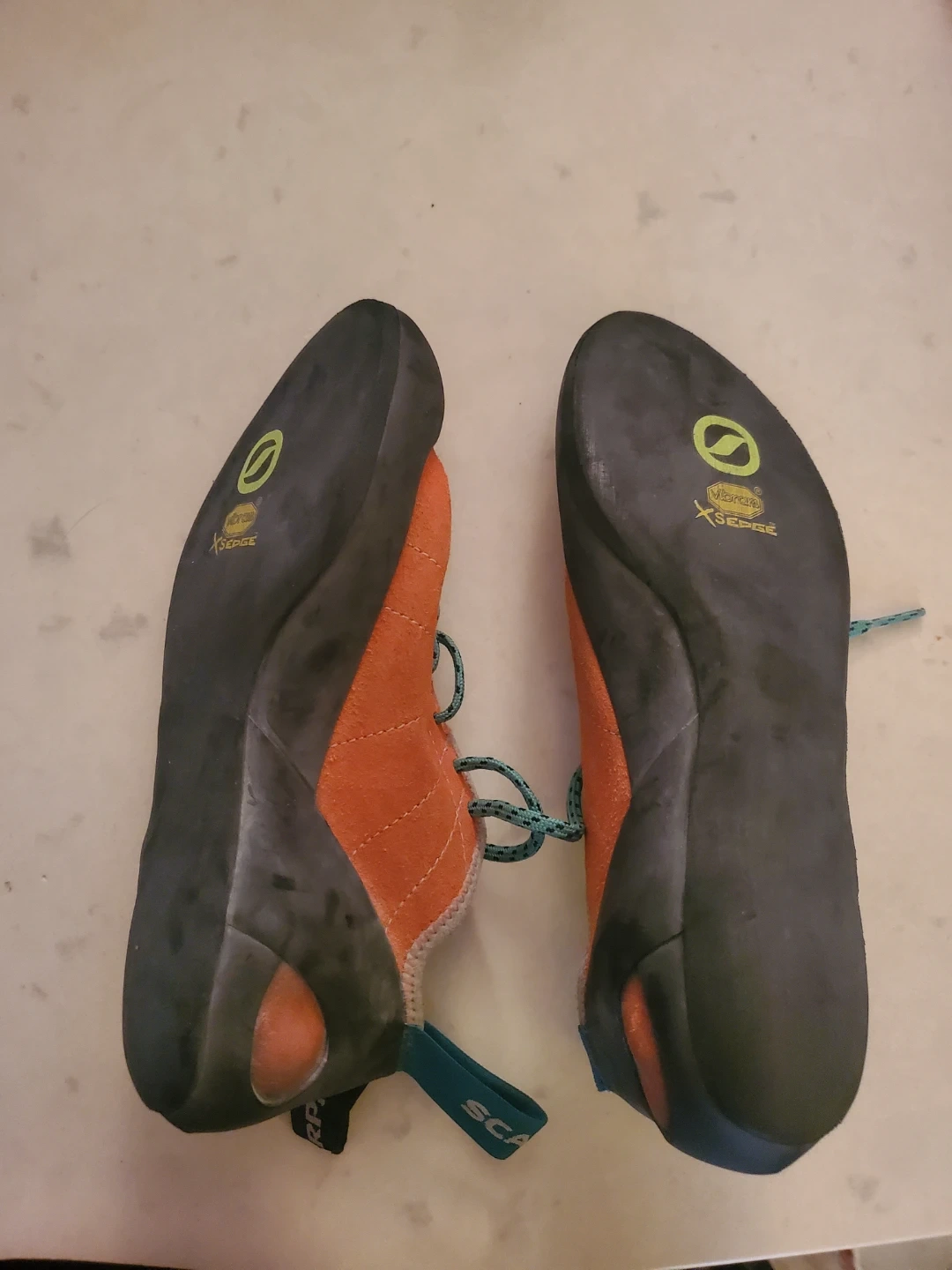 Scarpa HEL WMN climbing shoes. Orange suede upper with Vibram XS Edge soles. Made in Italy. Size 38 EU. These are great for gym climbing or outdoor sport routes!