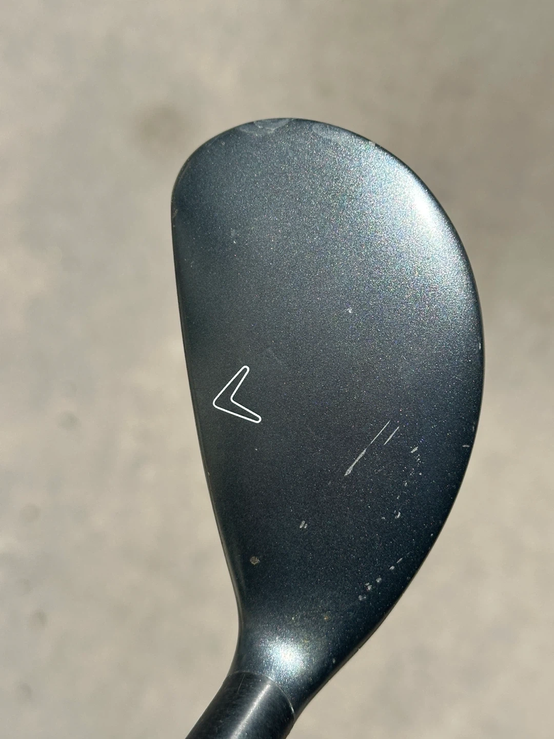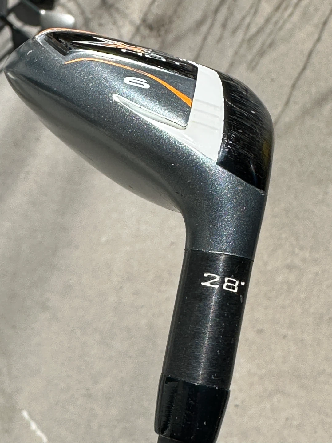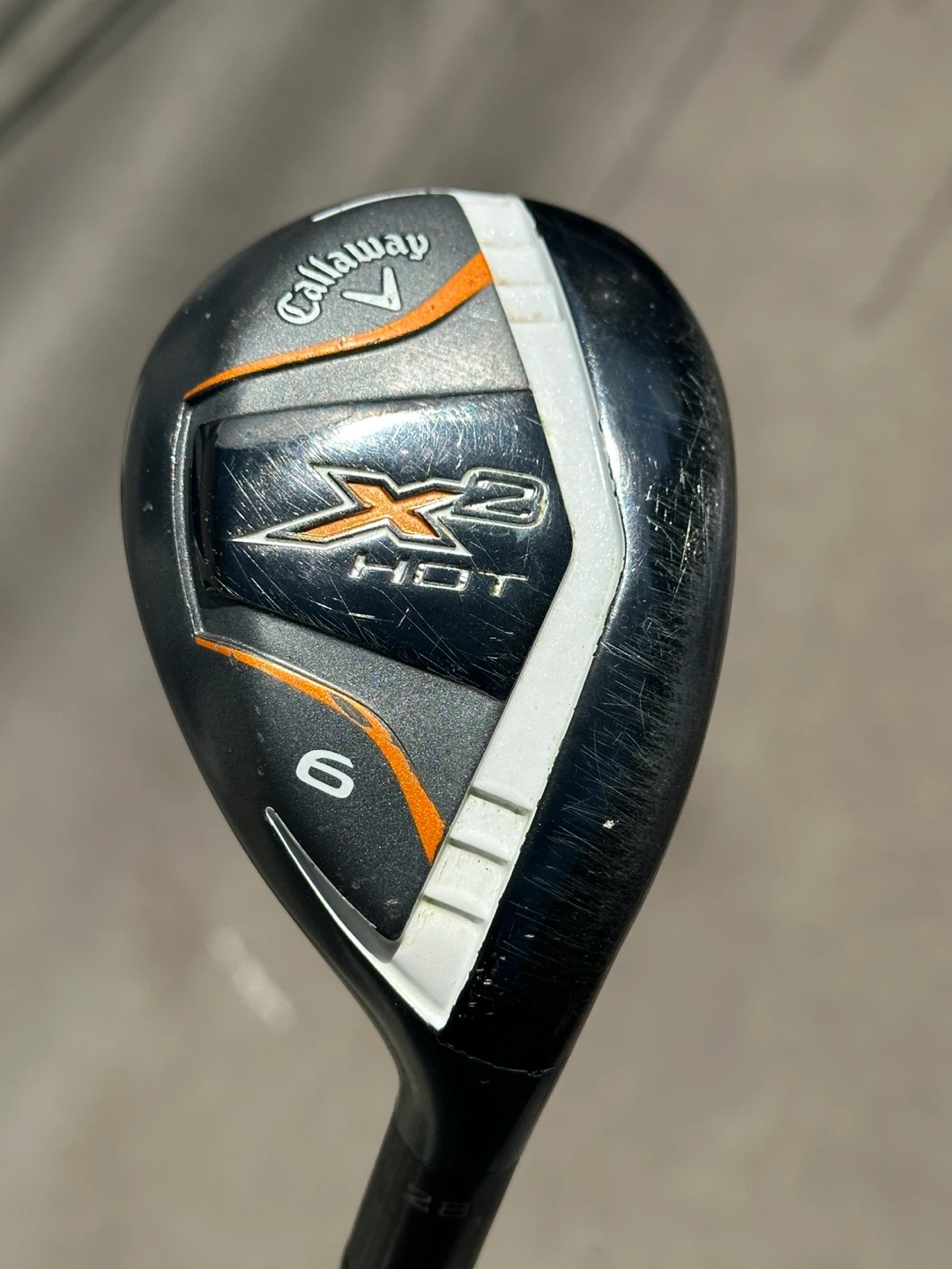 This is a Callaway X2 HOT hybrid golf club. It has 28 degrees of loft. The club face features score lines for improved ball contact.