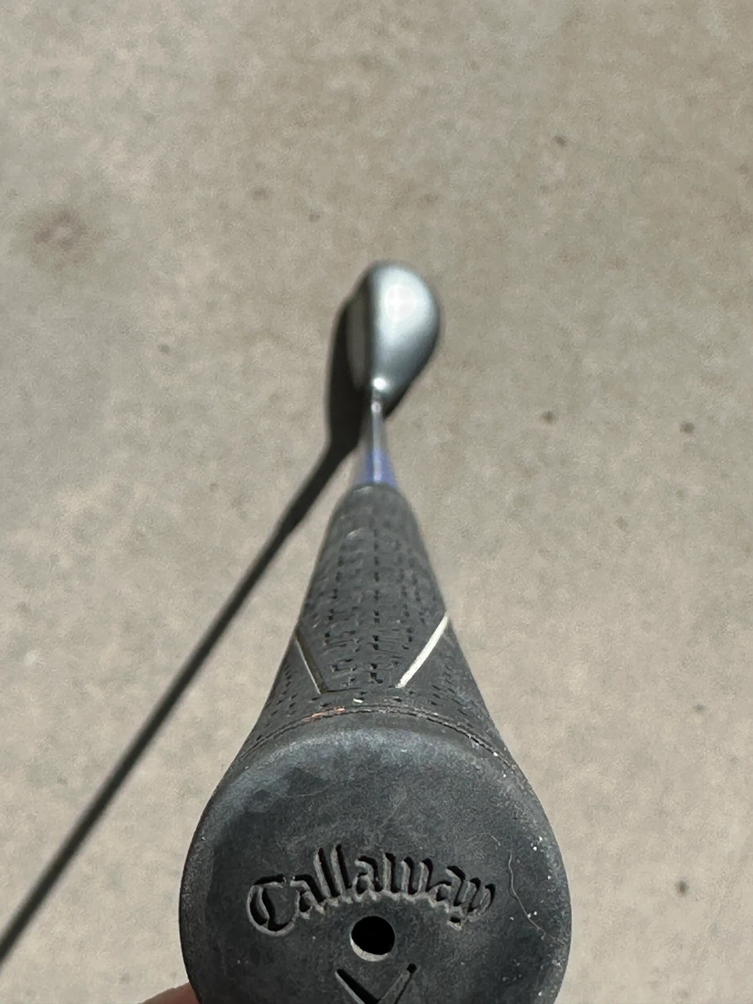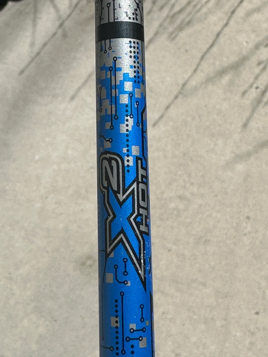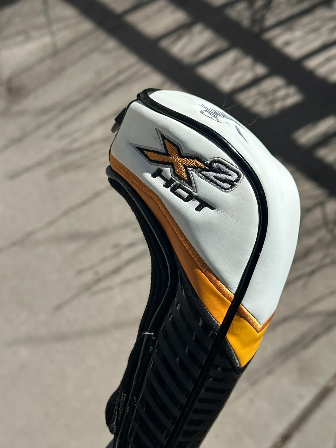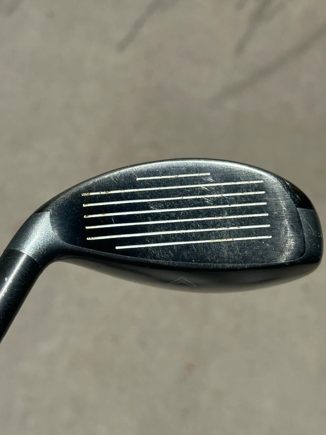 This is a Callaway X2 HOT hybrid golf club. It has 28 degrees of loft. The club face features score lines for improved ball contact.