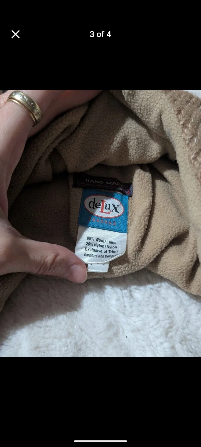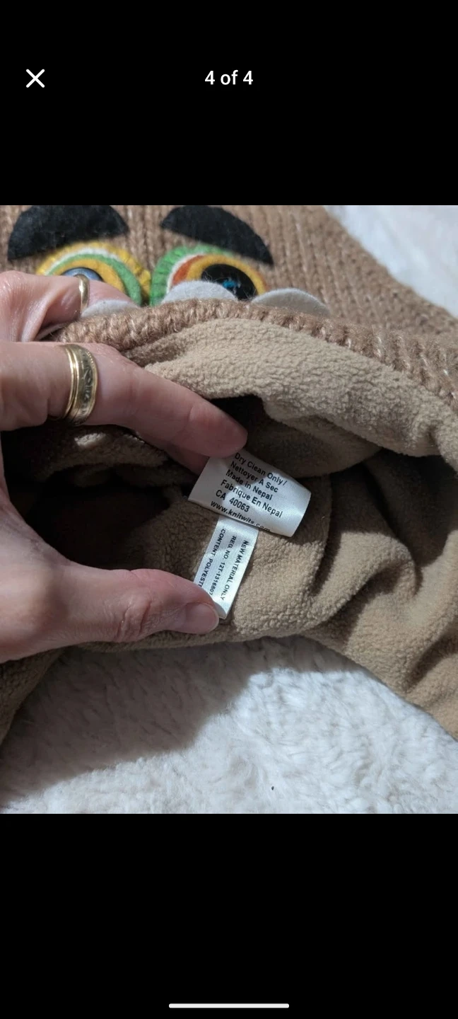 This DeLux knitted hat is designed for kids and features a fun monster face. It's made with a blend of 80% wool and 20% nylon for warmth. The hat includes ear flaps and ties with pom-poms. It's lined for extra comfort.