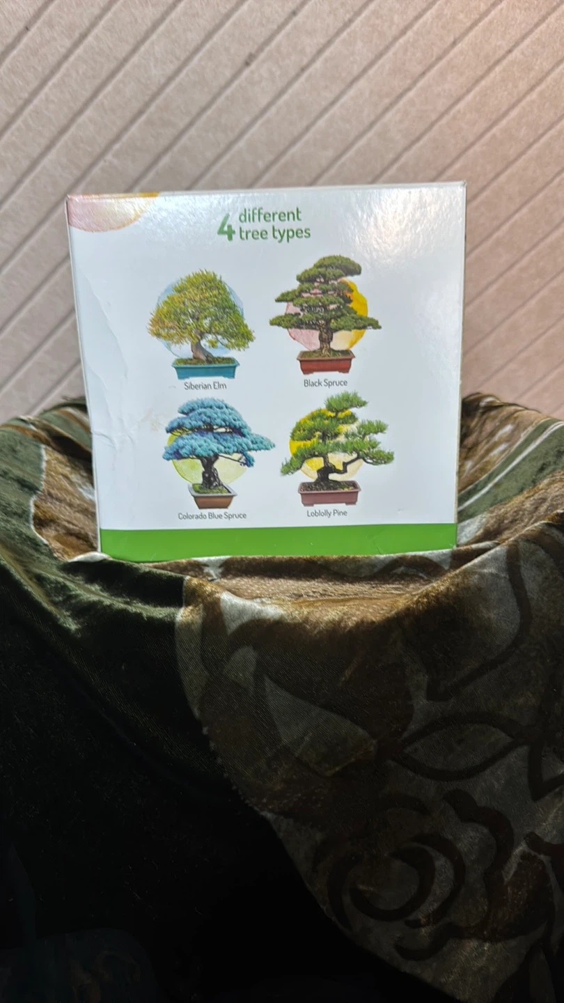 This NatureiT Bonsai Starter Kit includes 4 different tree types. It contains 4 seed packets for Colorado Blue Spruce, Black Spruce, Siberian Elm, and Loblolly Pine. You also get 4 peat soil discs and 4 biodegradable pots for replanting, plus 4 plant markers. An instruction manual is included for guidance. Box is a bit bashed but everything inside is perfect.