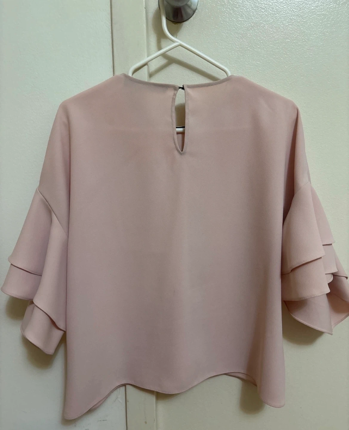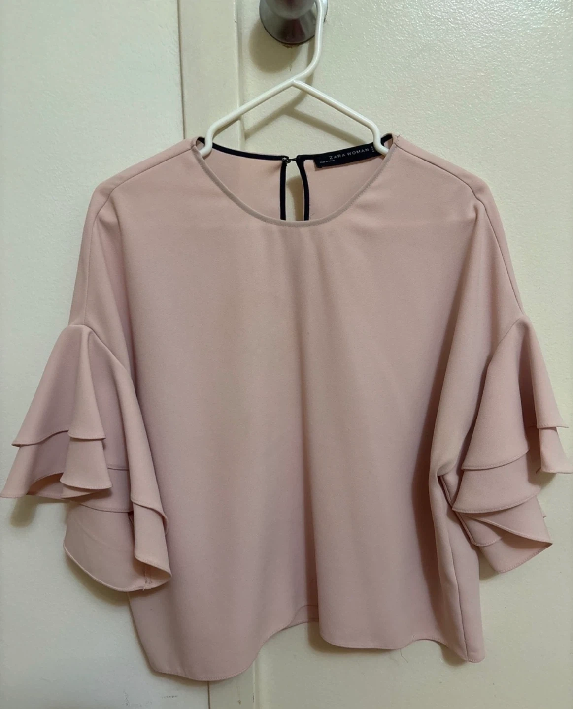 This ZARA Woman top is a lovely pale pink colour. It features unique tiered ruffle sleeves, giving it a stylish flair. Fits size medium, in great condition!