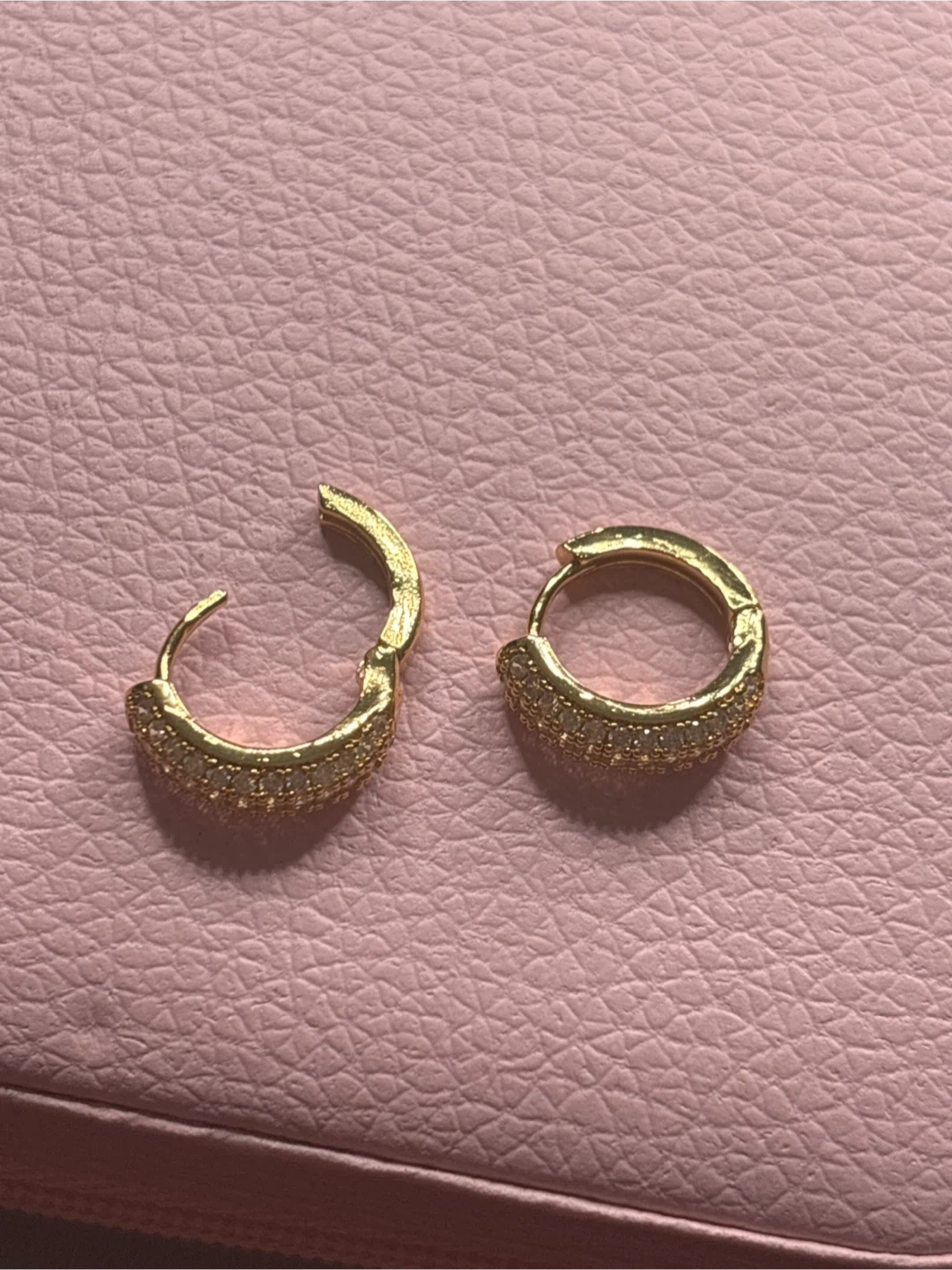 Sparkly gold hoop earrings set with small rhinestones. These dainty hoops add a touch of bling to any outfit. They're a classic accessory for everyday wear or special occasions!