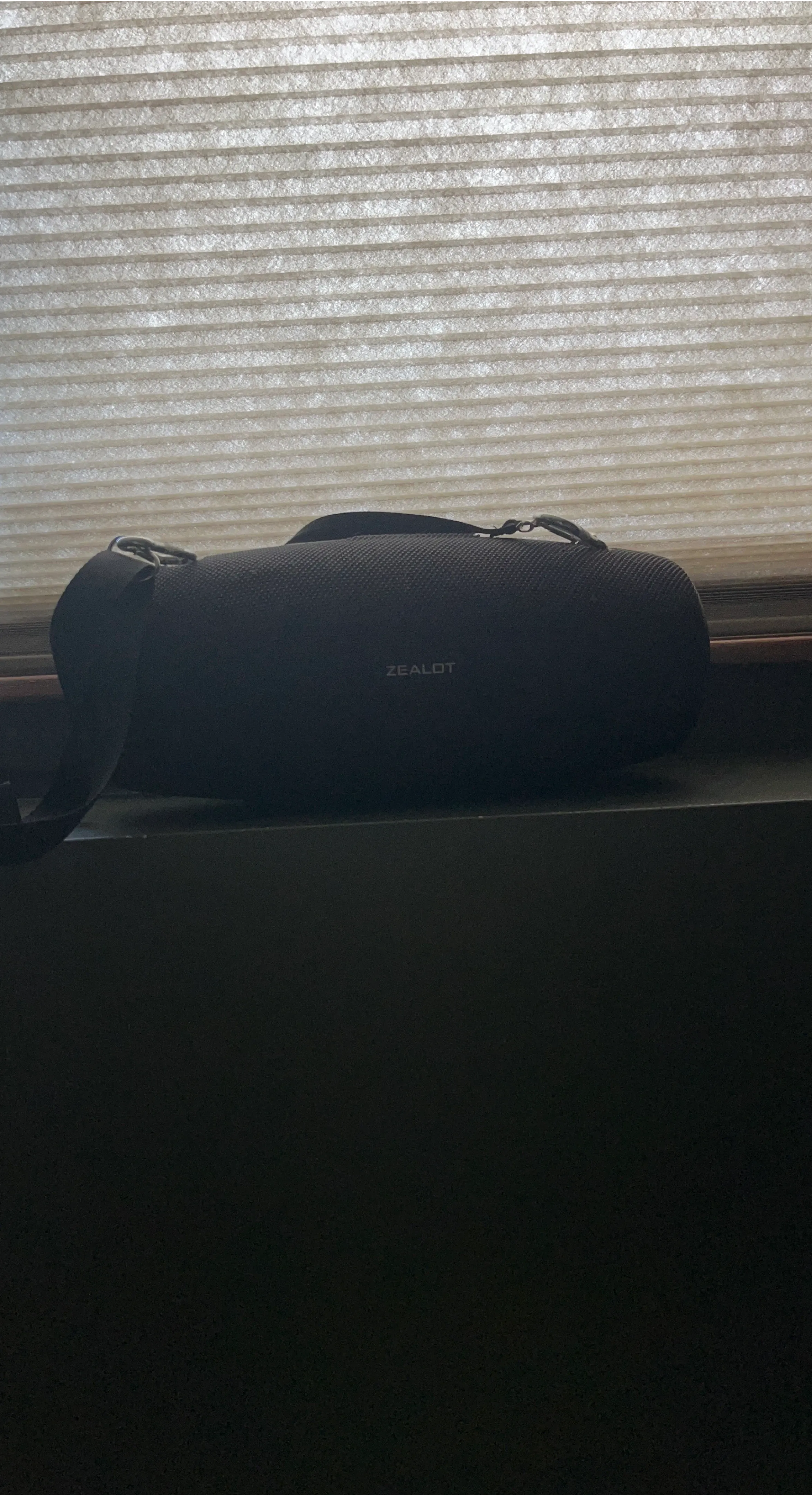 Zealot portable speaker in black. It has a fabric exterior and a strap for carrying. Great for outdoor events or personal listening!