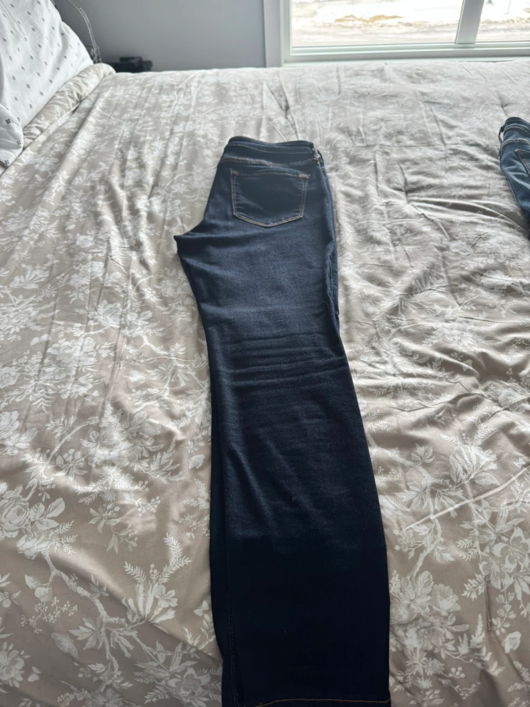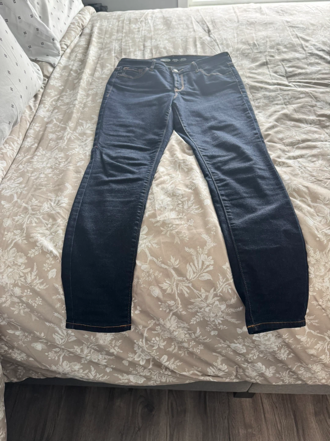 Classic dark wash bootcut jeans from Old Navy. These jeans are a women's size 4 Long. They're made with a comfortable denim blend. Perfect for everyday wear!