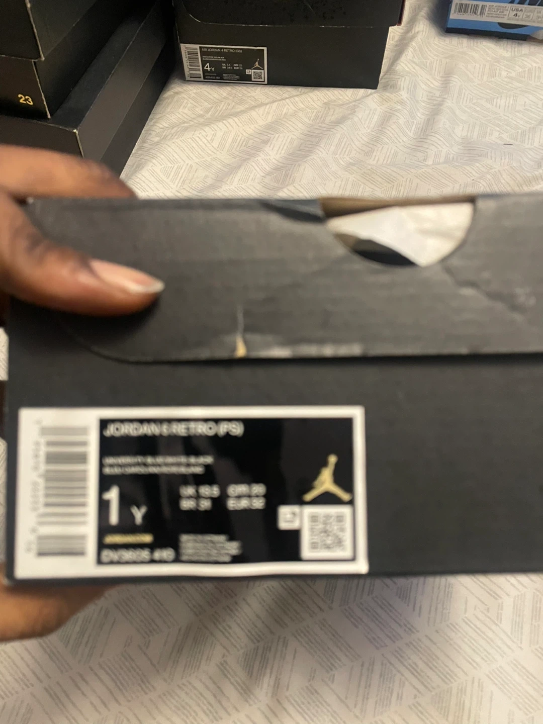 These are Jordan 6 Retro PS sneakers in a University Blue and white colourway. They come in a youth size 1Y. Includes original box and packaging.