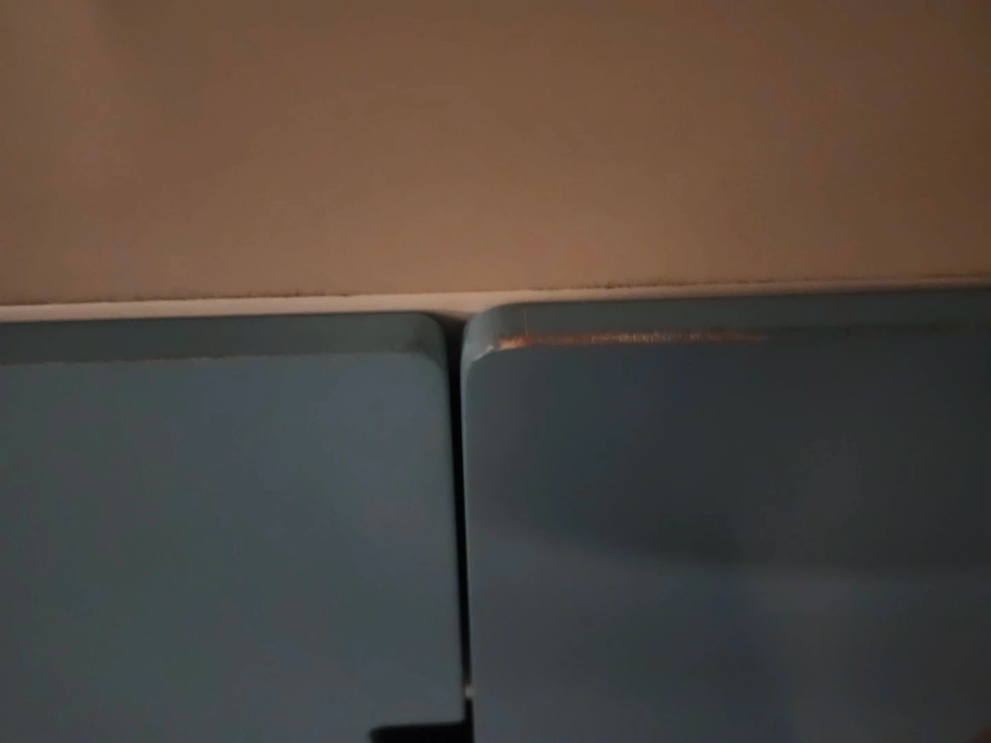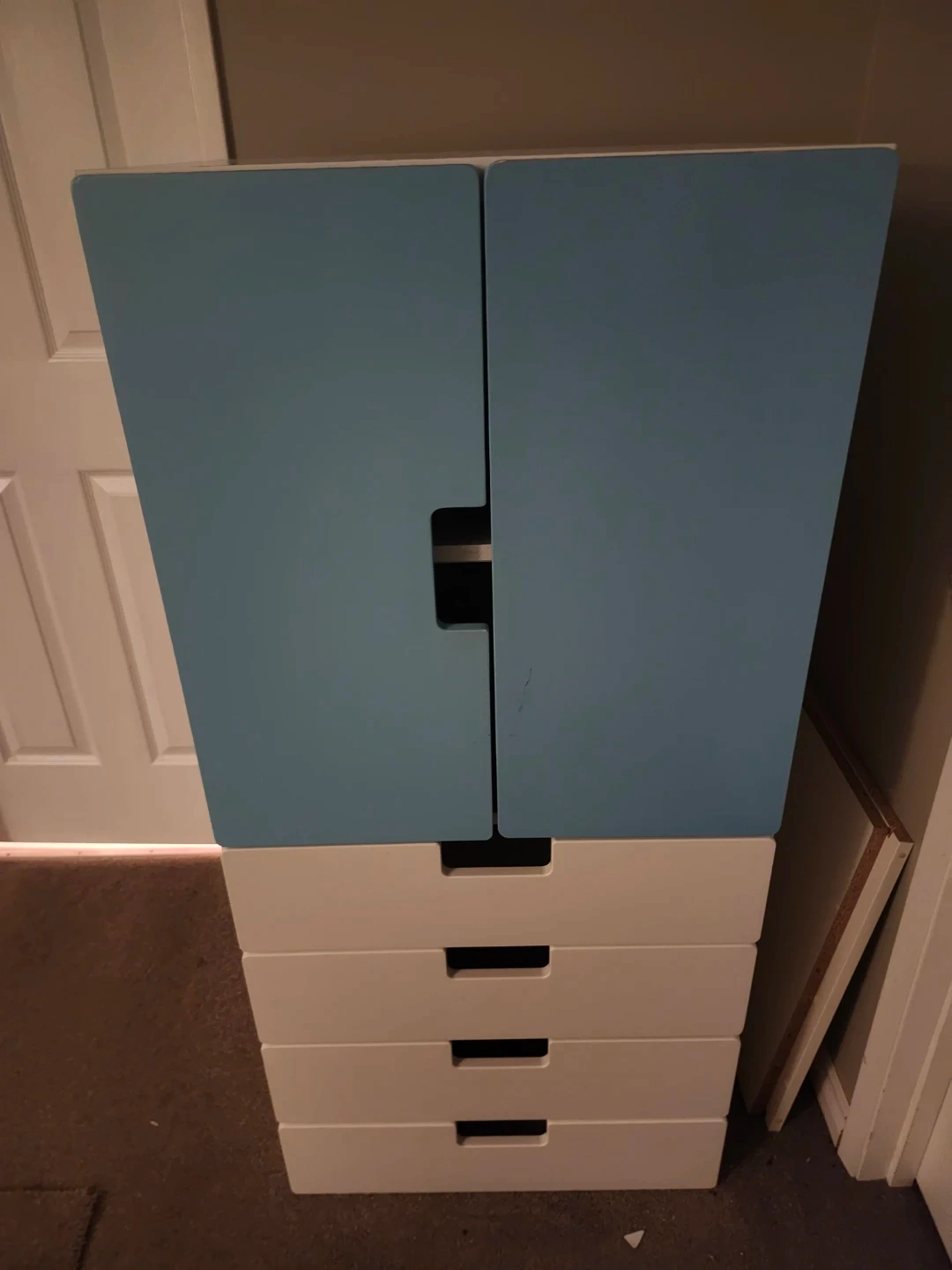 This storage cabinet features two blue doors and four white drawers. It has two shelves inside the cupboard space. The blue doors have simple cut-out handles.