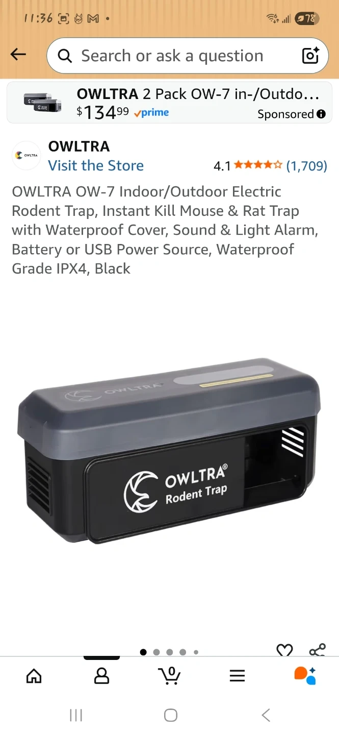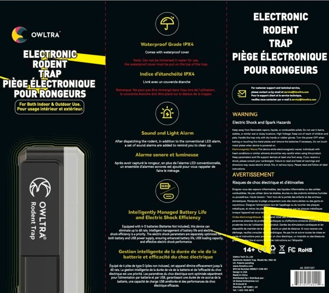 This OWL TRA rodent trap offers an instant kill with high-voltage technology. It features a sound and light alarm for notifications. It's waterproof grade IPX4 and comes with a waterproof cover for outdoor use. This trap can be powered by battery or USB.
