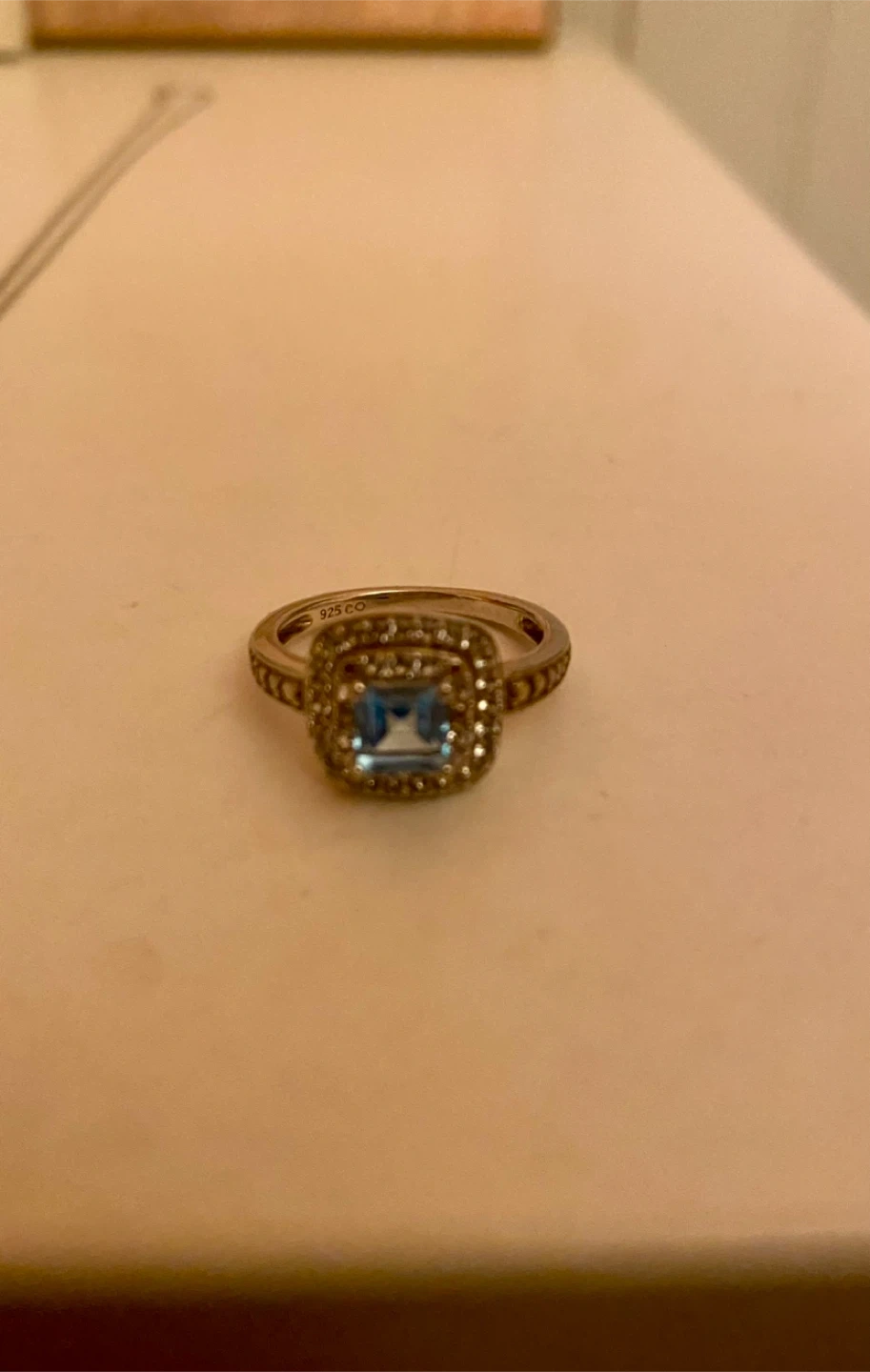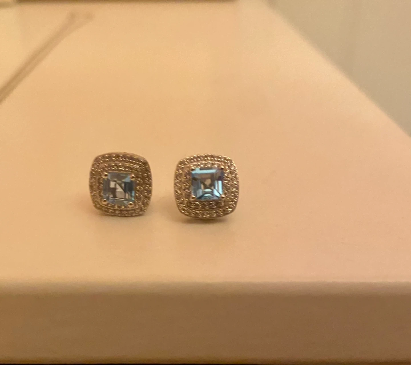Selling a beautiful necklace, ring and earring set. The set features a square-cut blue topaz stone surrounded by sparkling accents. Perfect for adding a touch of elegance to any outfit