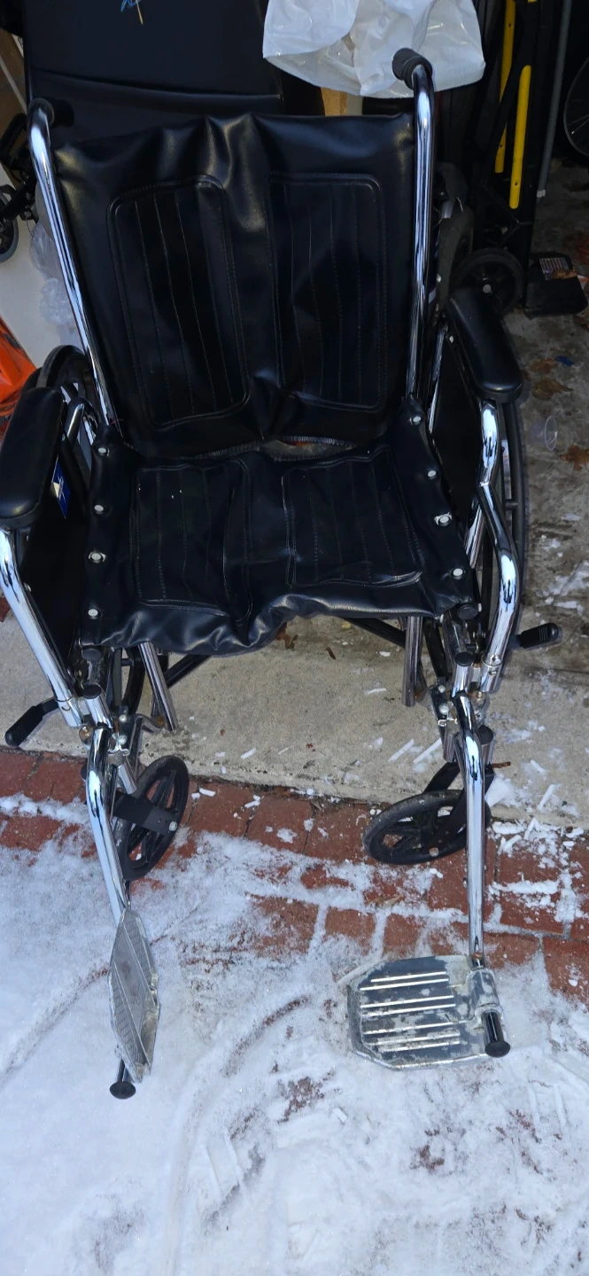 This is a black vinyl wheelchair with a chrome frame. It features padded armrests and footrests for comfort. It's a standard size wheelchair.