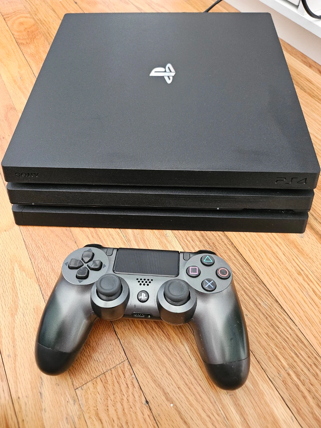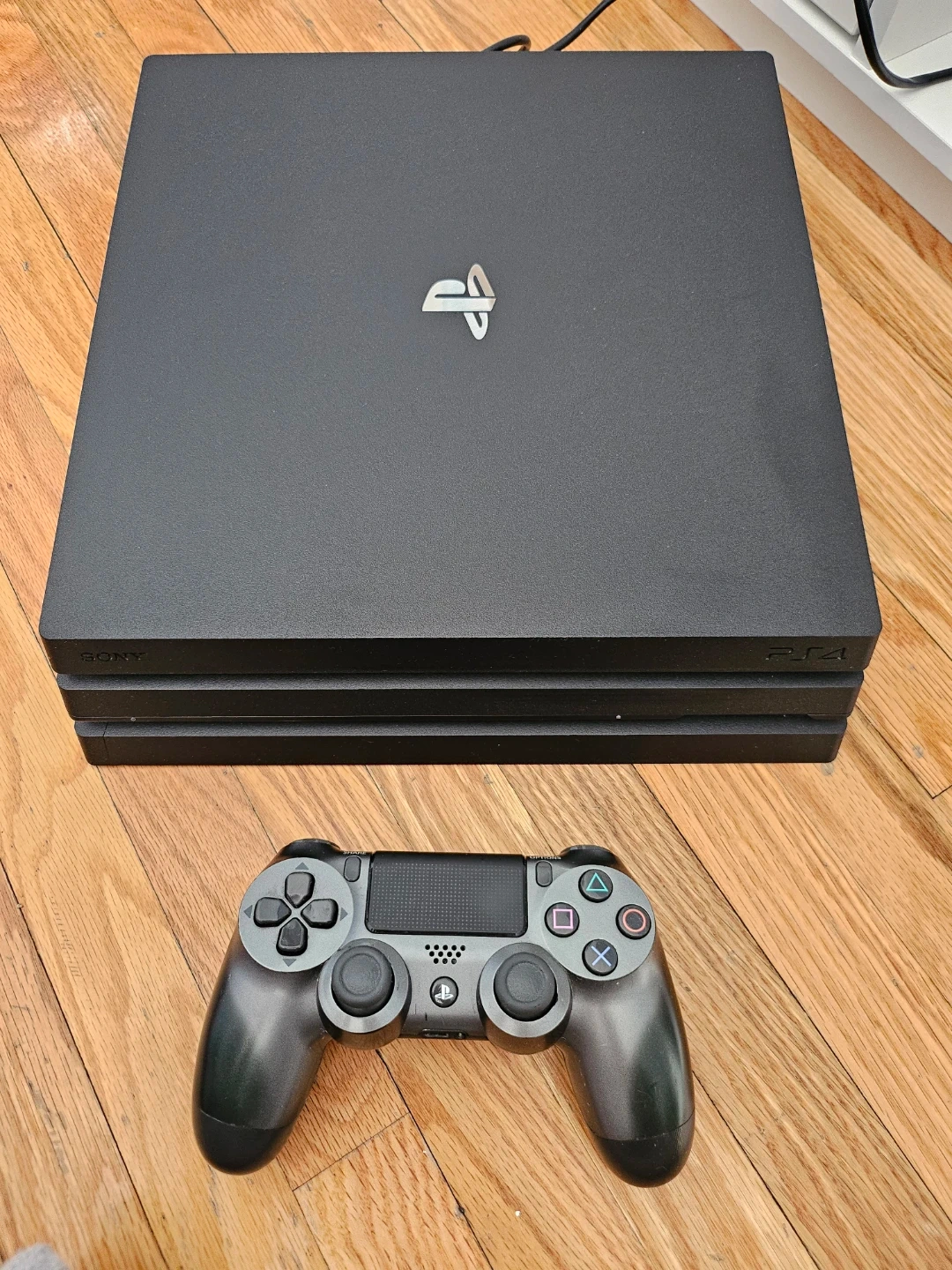 Selling a Sony PlayStation 4 Pro with 1TB of storage. It comes with one DualShock 4 controller. This console is black and supports 4K gaming.