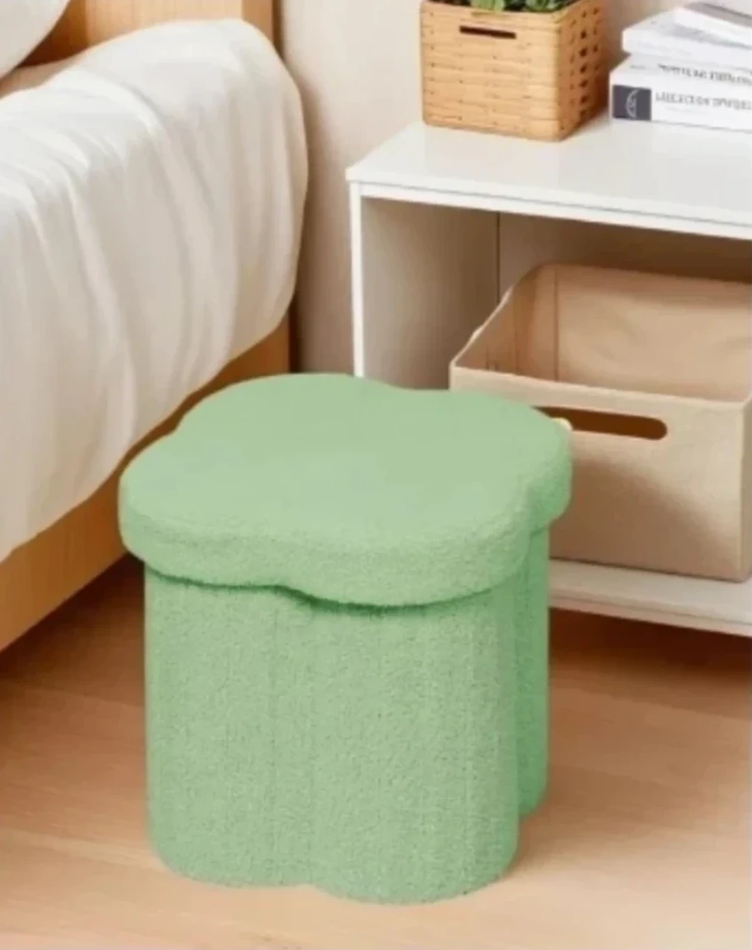 This cute ottoman stool is upholstered in soft, fuzzy green fabric. It can be used for seating or as a footrest. Dimensions are 32cm deep, 32cm wide, and 32cm high.