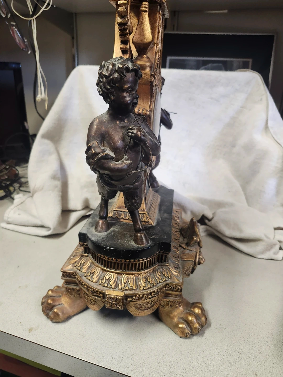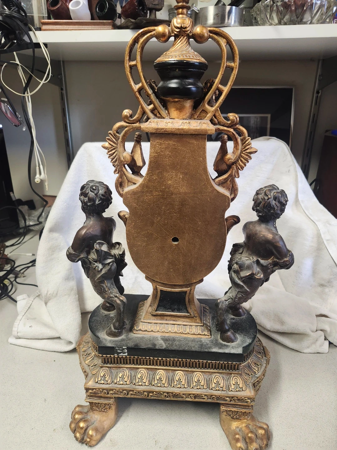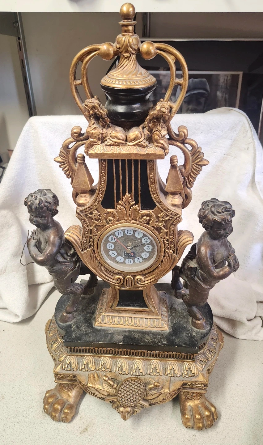 This vintage mantel clock features ornate cherub figures and a lyre design. It has a gold-tone finish with dark accents. The clock face displays hour and minute hands.