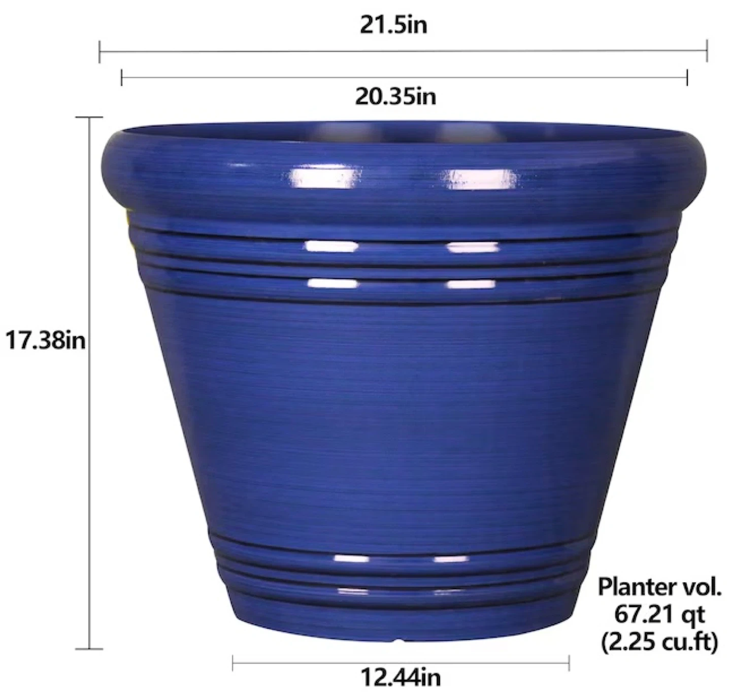 Description: Upgrade your outdoor space with these Jumbo Style Selections planters in a glossy blue finish. These are extra-large, heavy-duty planters made from durable recycled polyresin plastic—weather-resistant, UV-protected, and surprisingly lightweight when empty.