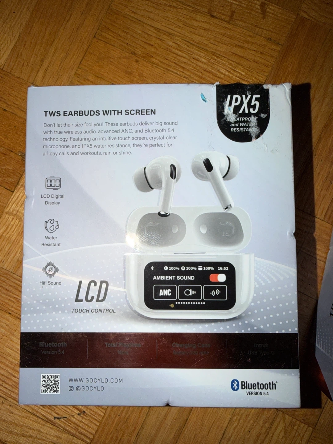 Selling a brand new pair of CYLO TWS earbuds with a screen! These earbuds feature an intuitive touch screen, advanced ANC, and Bluetooth 5.4 technology. They're also sweatproof and water-resistant with an IPX5 rating, perfect for workouts or rainy days. The box advertises a total playtime of 100 hours