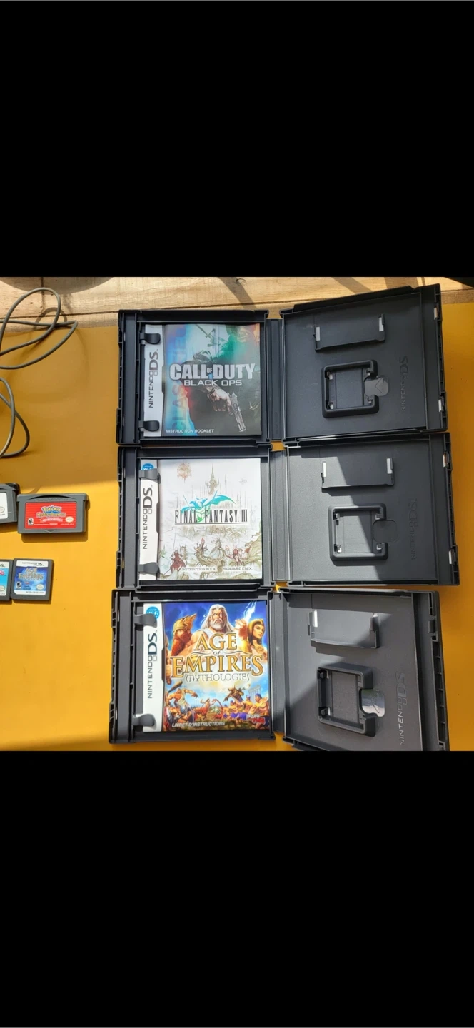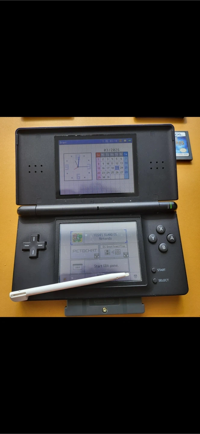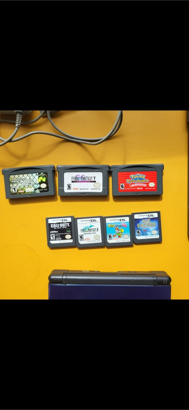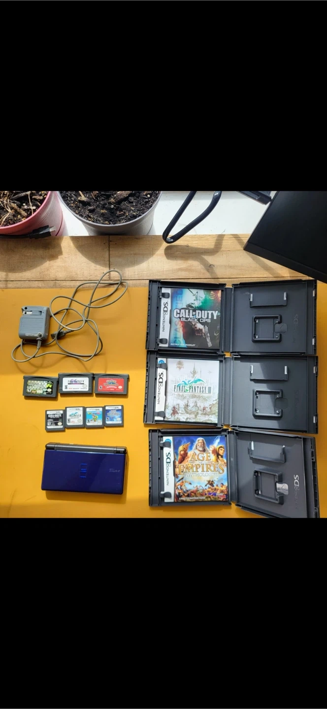 Nintendo DS Lite in dark grey, includes stylus and charger. Bundle comes with several games: Call of Duty, Final Fantasy III, Age of Empires, Yoshi's Island DS, and more. It's a great way to play classic DS and GBA titles!