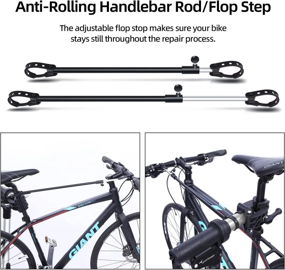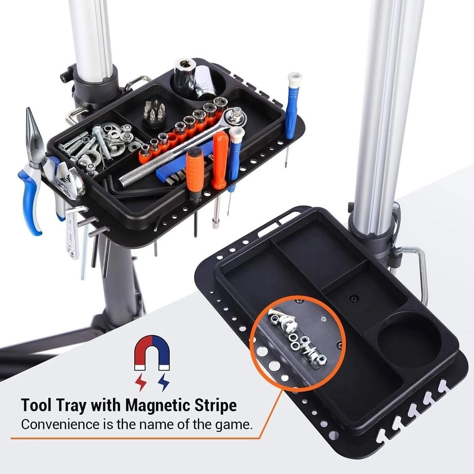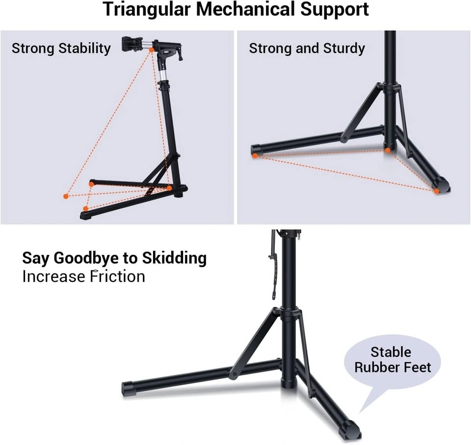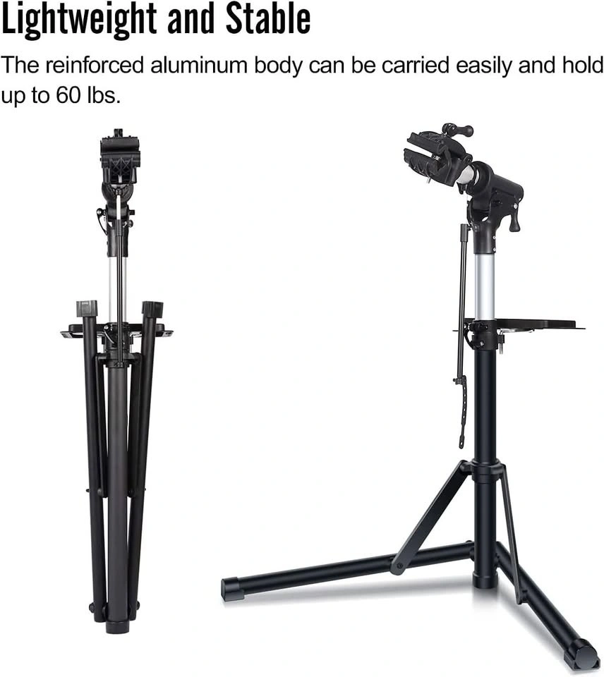 This Techshark bike repair stand uses a triangular structure for support and has rubber foot pads for increased stability, protecting the bracket from wear and tear. The stand features a strong, 1.43-inch diameter circular tube with 0.1-inch wall thickness, and two additional braces for extra stability that can be retracted for easy storage. The premium aluminum body is lightweight, ultra-stable, and can hold up to 60 pounds. It folds flat for convenient storage. The main body extends up to 5.3 feet, and the gripper rotates 360°, perfect for sitting or standing work. Foam support jaws grip your bike securely without damaging the paint or frame. Includes a magnetic tool tray for organizing small parts and a retractable rod to stabilize the front wheel.