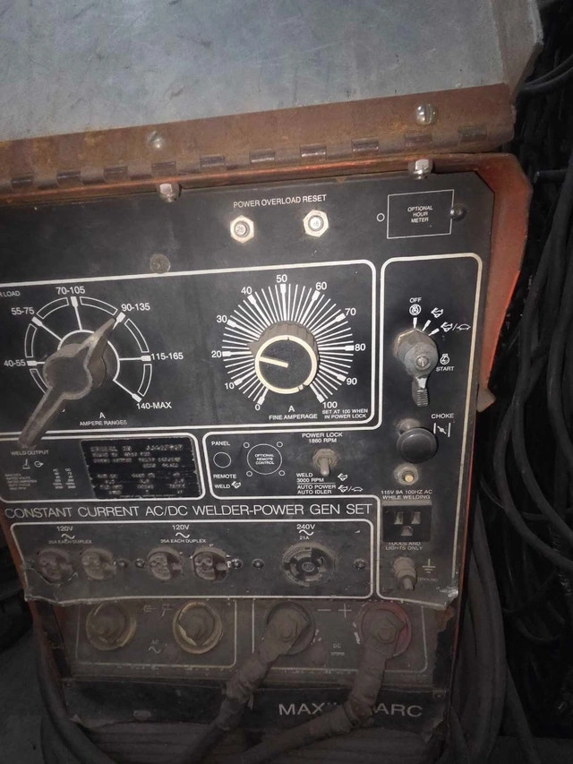Older Onan/Miller Ac/Dc 18 h.p. gas engine welder-generator. Older unit with no hour gauge, probably around 2000 hrs but well maintained. Look at nameplate photo for machine specs. Can be fired up to test, but will need a battery for everyday use. Has constant power while welding plug (120 volt @ 9A). Also has 2 duplex 120 volt plugs for gen only @ 25A and one Nema 17 240 volt plug @ 21A. Comes with 50 foot 1/o cables attached with twist lock tweco style ends. These machines were built to last and run consistent under heavy load and distance. $3000.00 O.B.O.