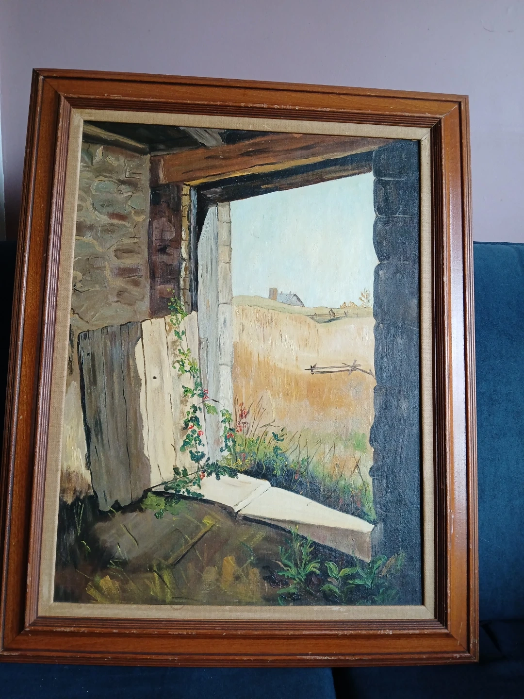 Original painting on an "Academy" canvas panel # 633. framed in wood. Subject: a view through a barn door, or stone threshold, featuring a weathered stone wall, wooden beams, and climbing vines with red berries, likely bittersweet. Style: Mid-Century modern. Medium: Oil on Canvas board. Grumbacher "Academy" canvas panel, depicting a rustic interior view looking out onto a rural landscape