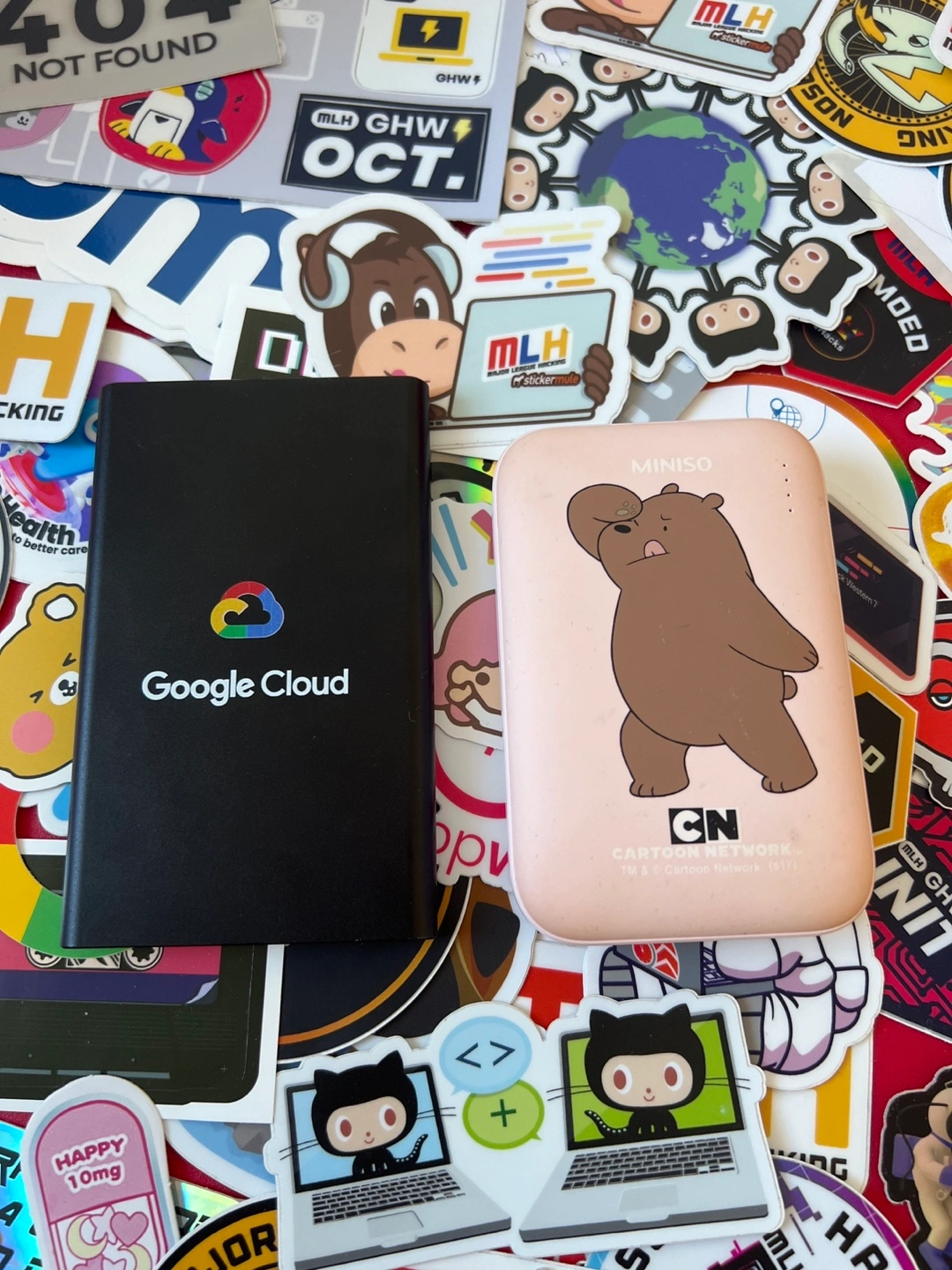 Two portable power banks. One is black with the Google Cloud logo and the other is pink with a cartoon bear.