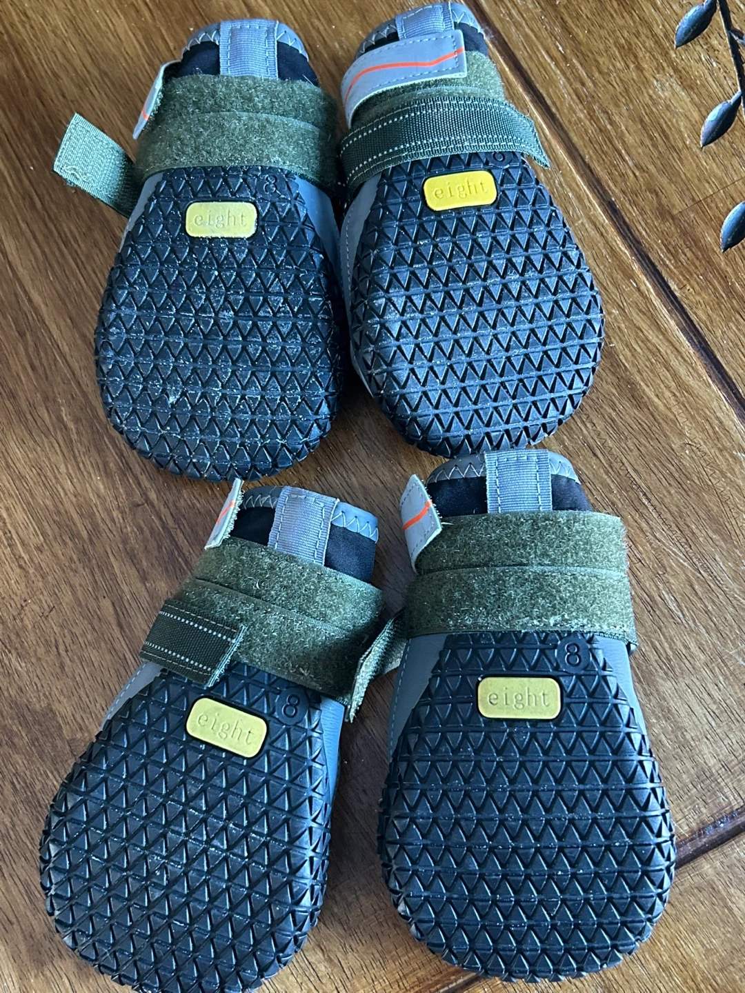 Set of four EIGHT brand dog boots, size 8. These boots feature a durable sole and adjustable straps for a secure fit. Protect your dog's paws from rough terrain and hot surfaces!