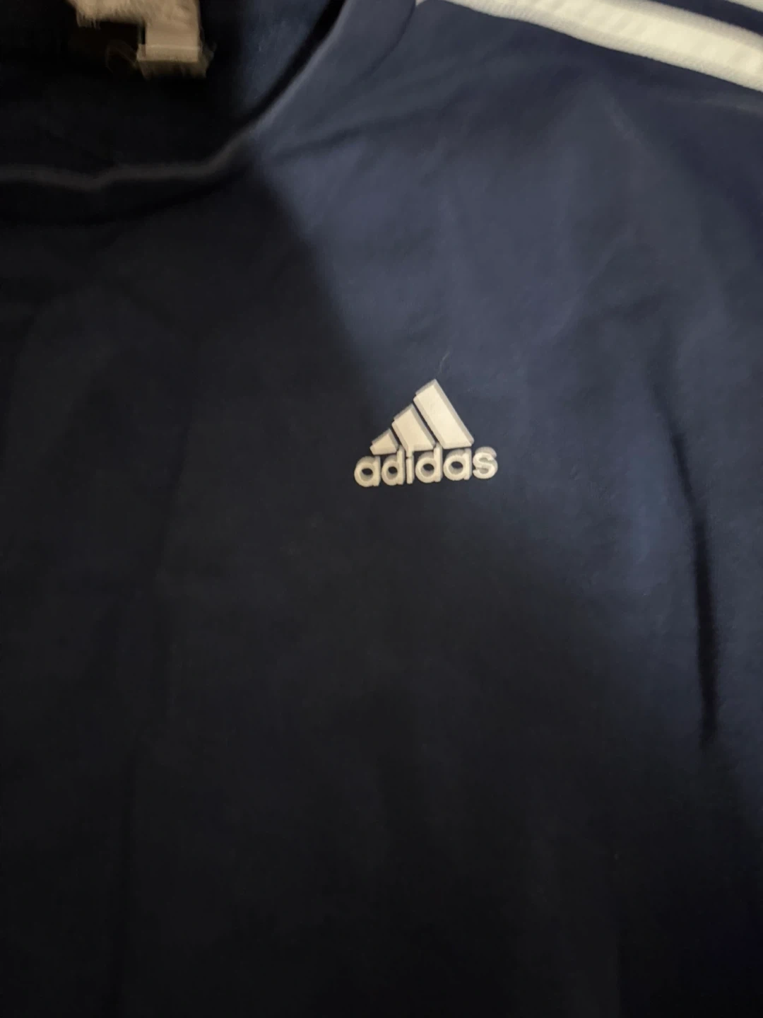 Navy blue Adidas crewneck sweatshirt with white stripes on the sleeves. It's a size medium, made from a cotton blend. Great for casual wear!