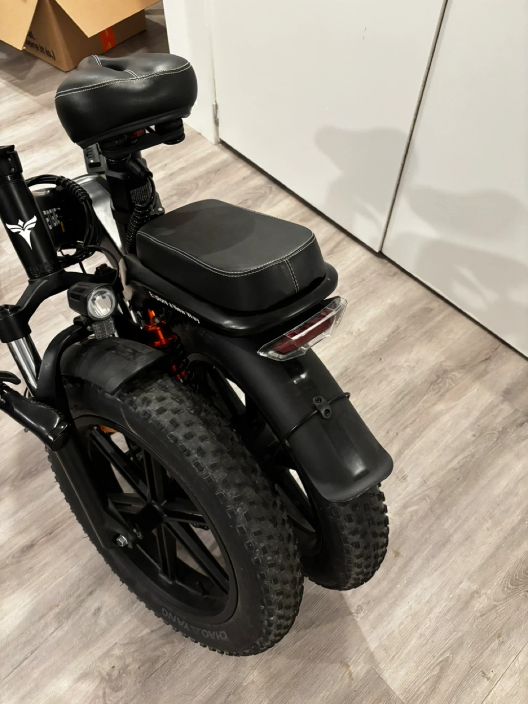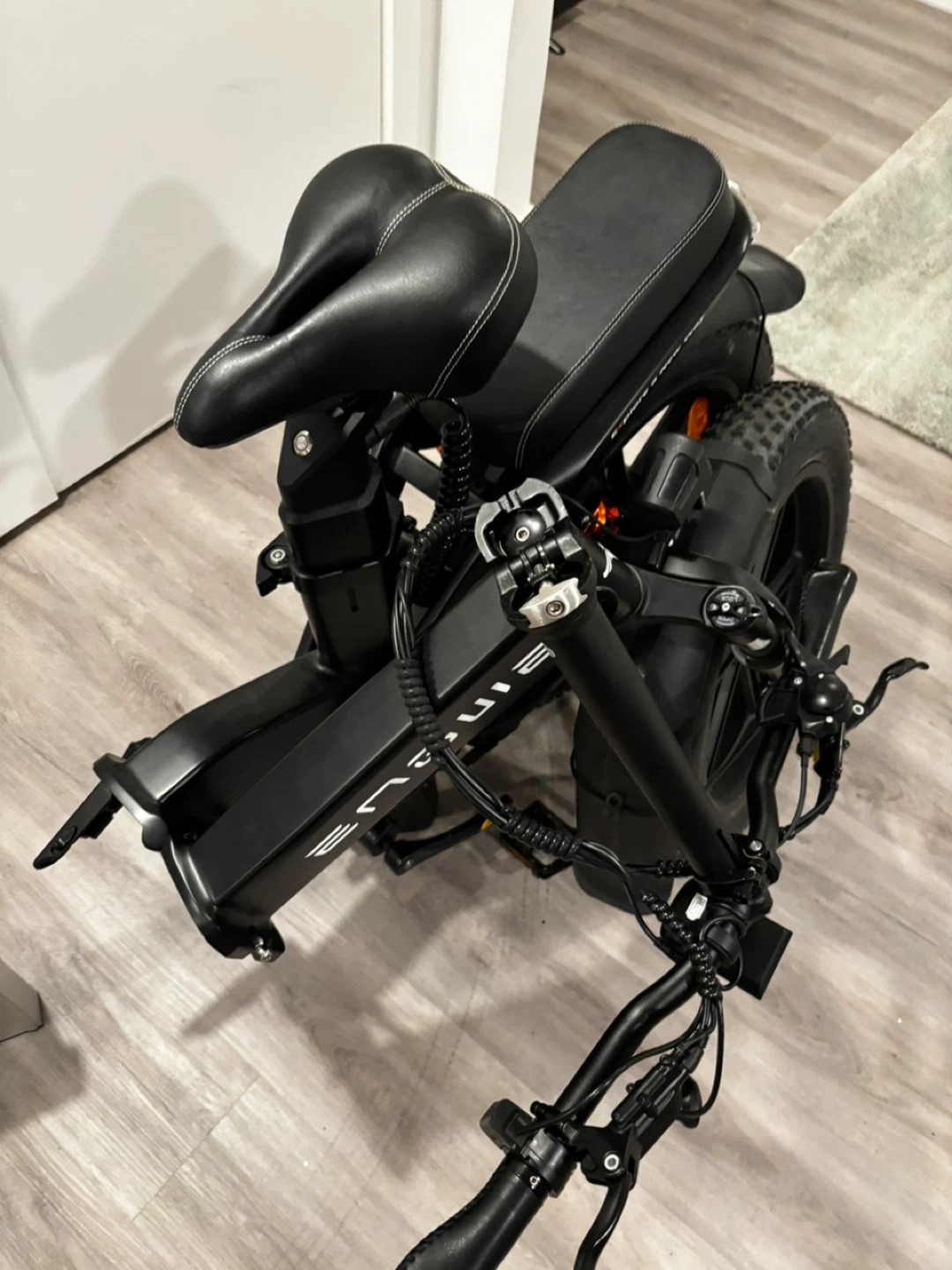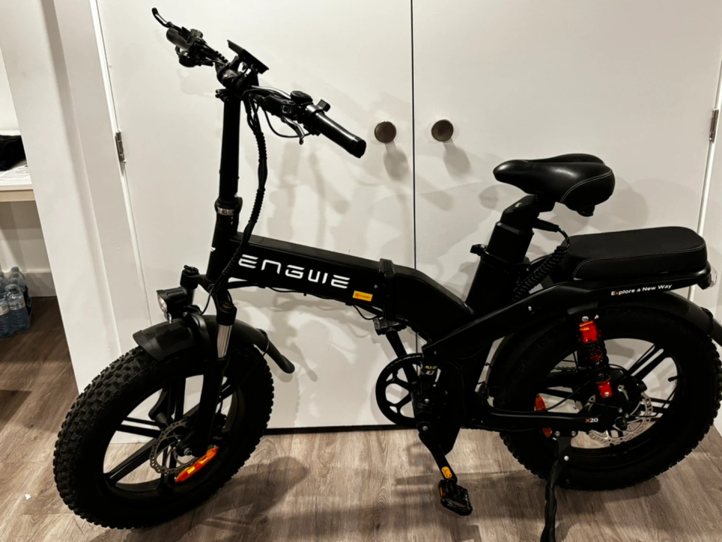 Thisw is an ENGUIE electric fat tire bike. It's a folding model with a black finish. Offers a powerful ride with its fat tires and electric assist. Perfect for navigating various terrains and for easy storage.