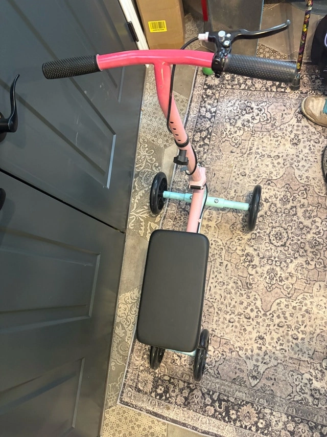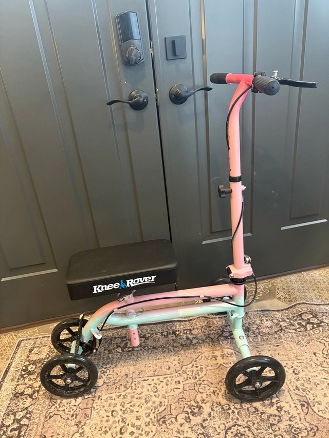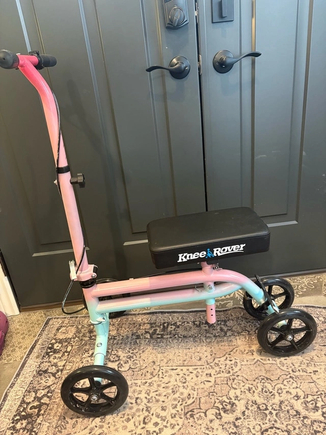 Knee Rover knee scooter in like new condition, only used indoors. Perfect for foot or ankle injuries - much easier and more comfortable than crutches. Asking $140, but open to offers as it needs to go! Features: smooth indoor wheels, adjustable handle and knee platform, comfortable padded knee rest, hand brakes for safety, and it folds for easy storage and transport. Extras include a small removable basket and a custom one-of-a-kind pink and blue ombre paint job. Clean, fully functional, and ready to use. Porch pickup in The Orchard, Burlington, Ontario.