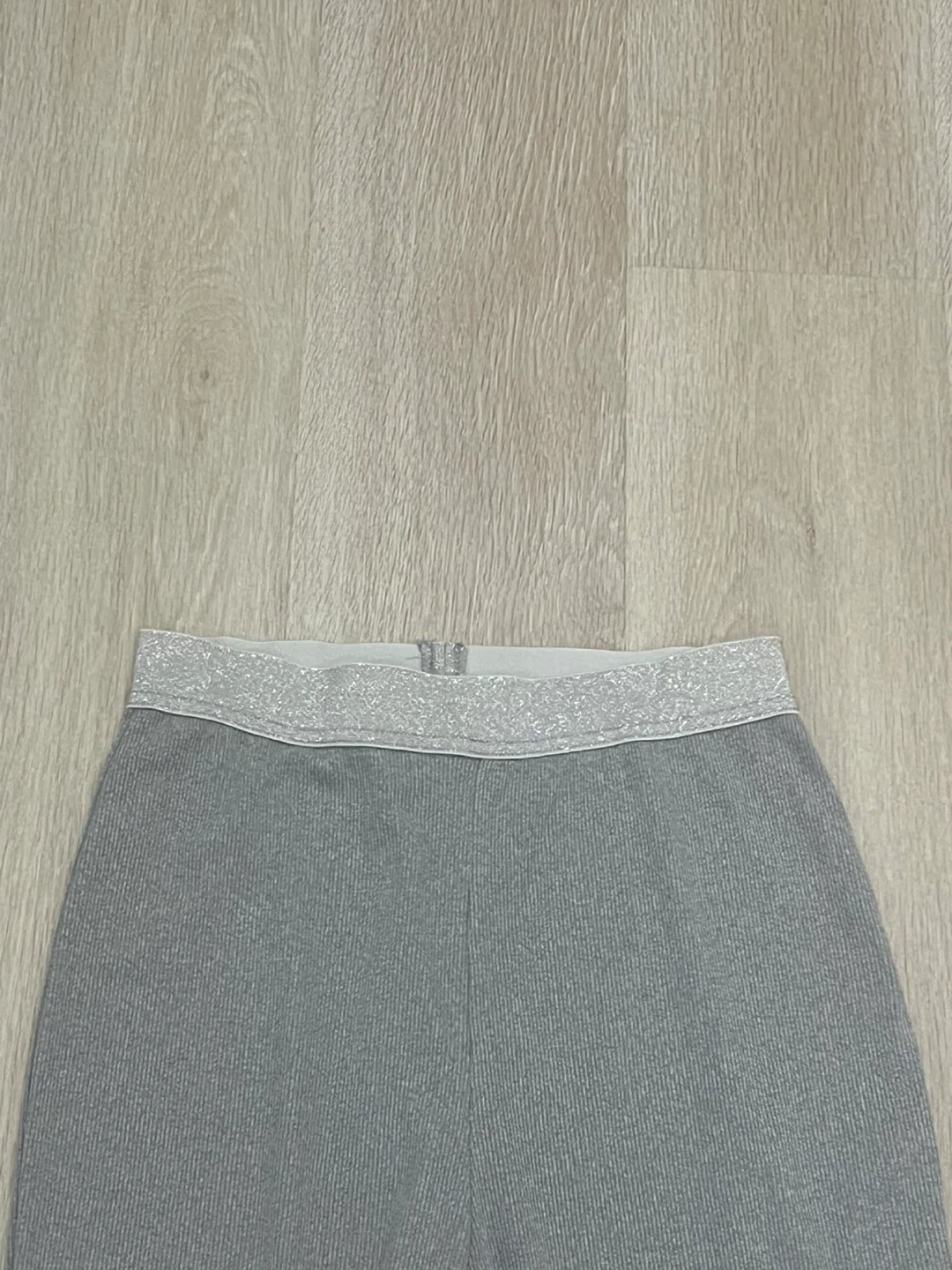Grey leggings with a sparkly waistband. These leggings are made from a ribbed knit fabric. They're comfortable for everyday wear! Tried once to try on.