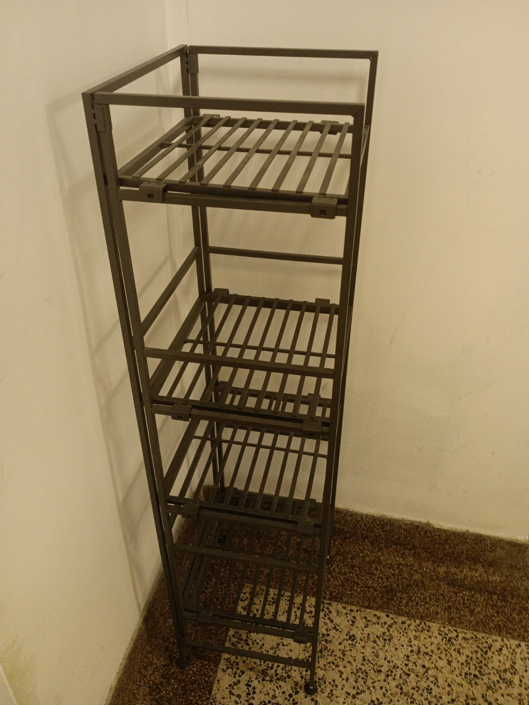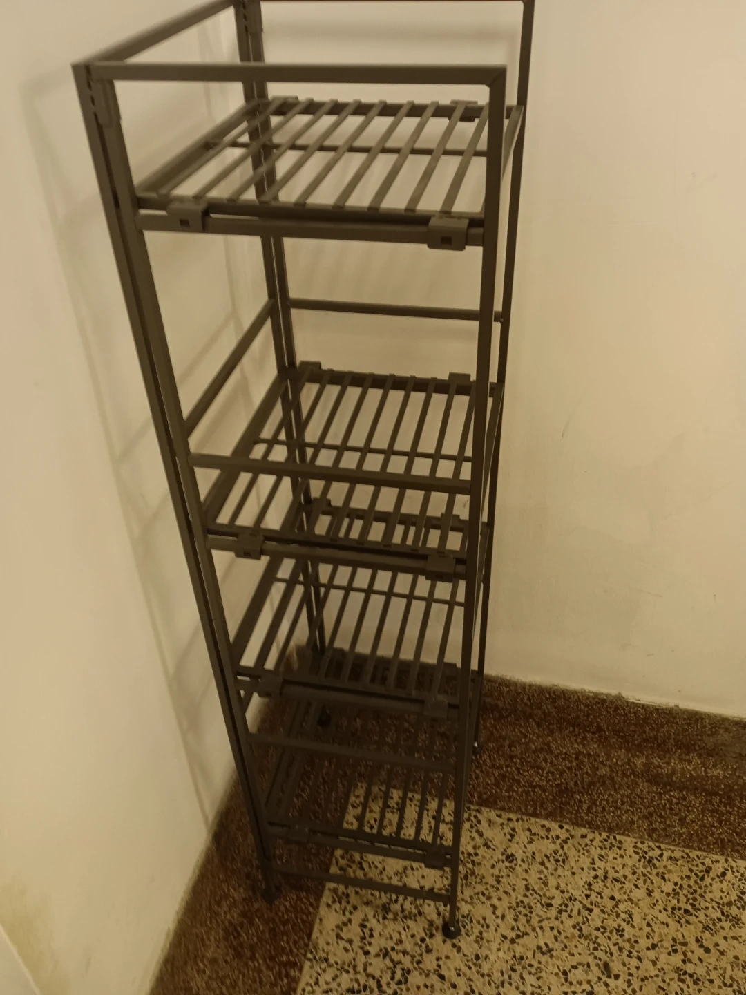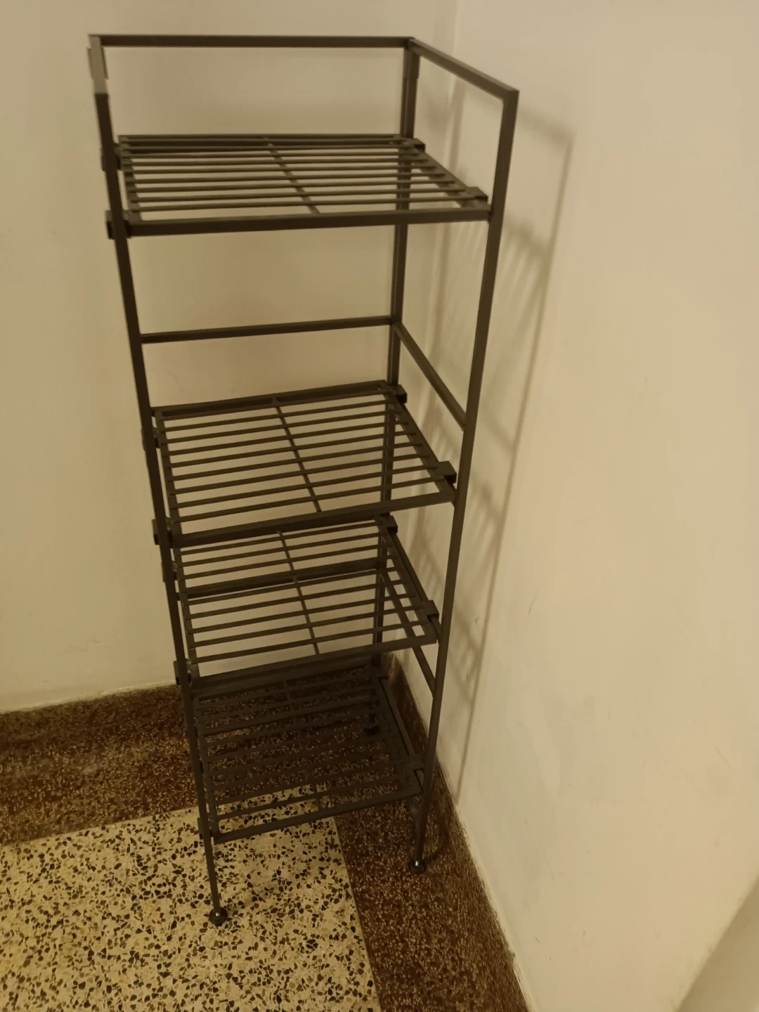 This is a dark grey metal shelf unit with four tiers. It's a sturdy, tall unit for storage or display. Its slatted shelves offer good air circulation.