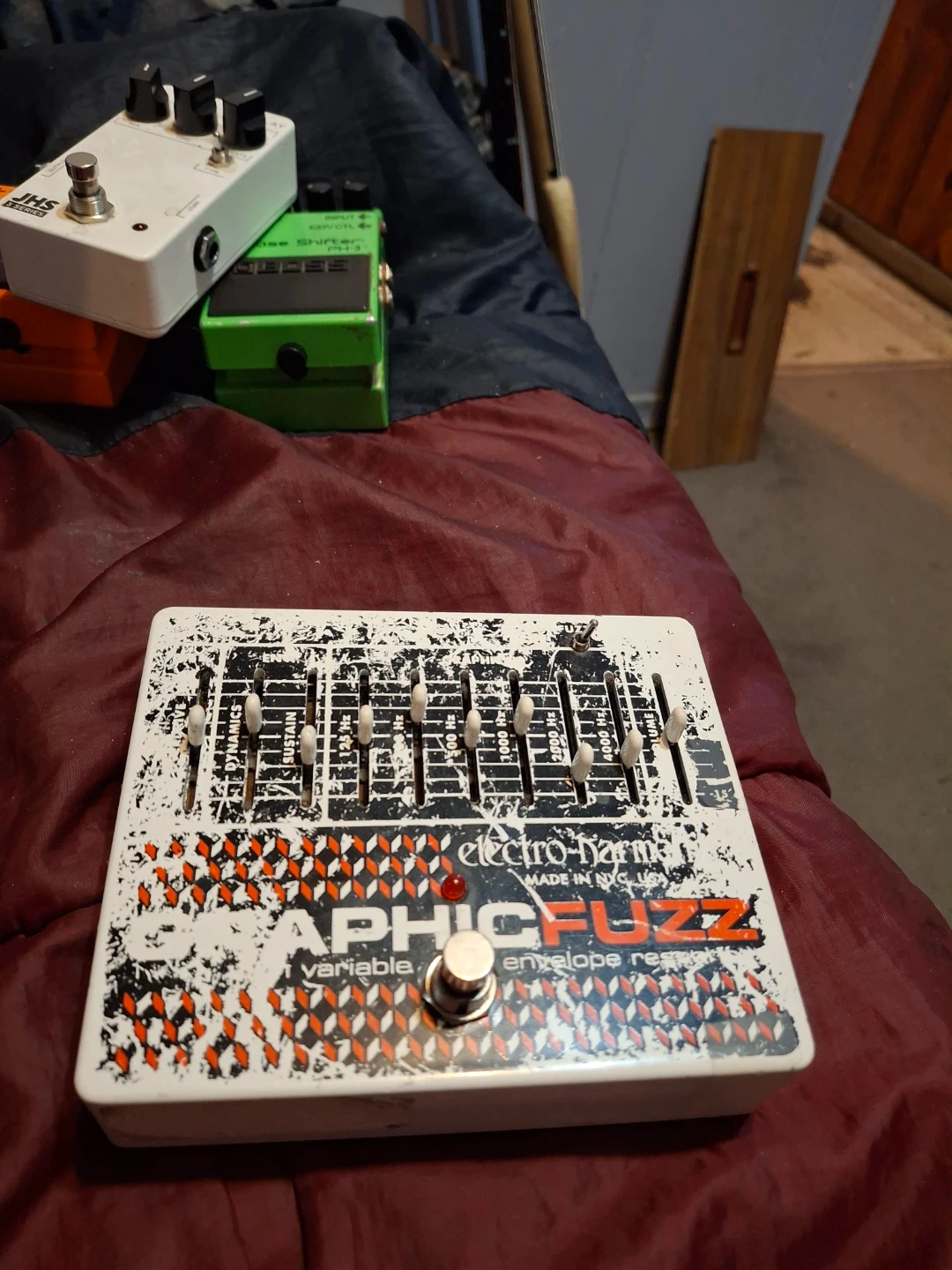 This is an Electro-Harmonix APHICFUZZ guitar pedal. It features adjustable controls