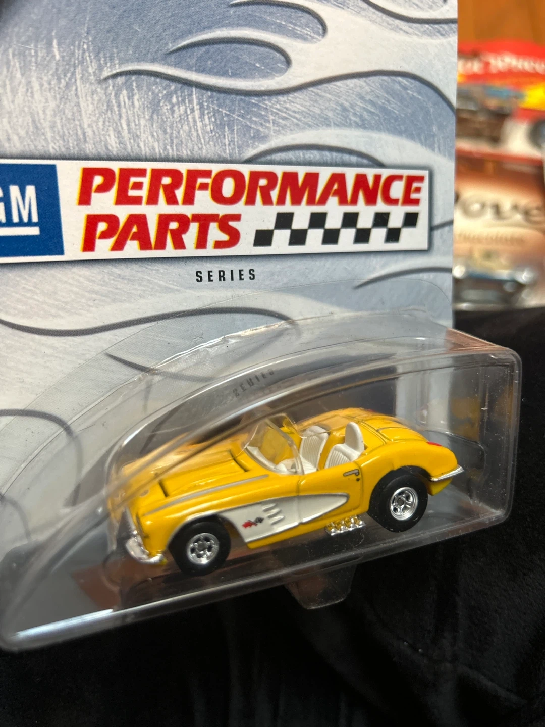Collectible Hot Wheels '58 Corvette. Die-cast car, yellow with white accents. Part of GM Performance Parts Series, No. 3/4. Still in original packaging, never opened. Has highly detailed engine, special wheels and tires. Metal body.