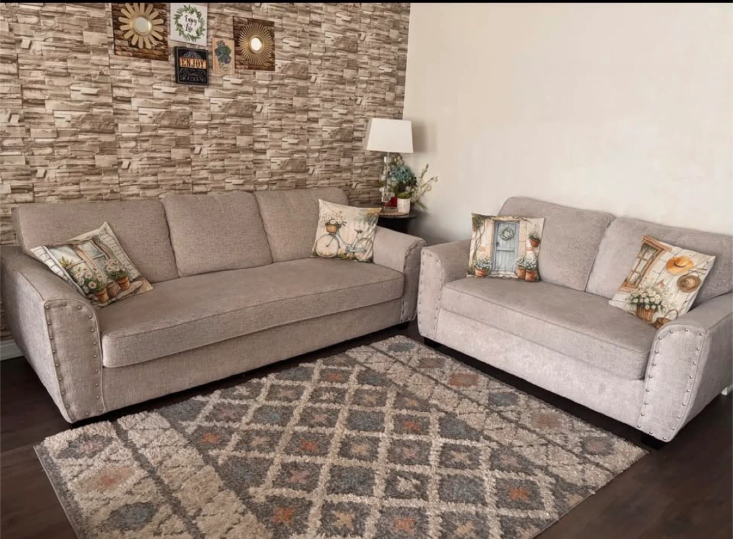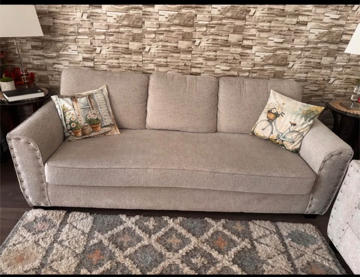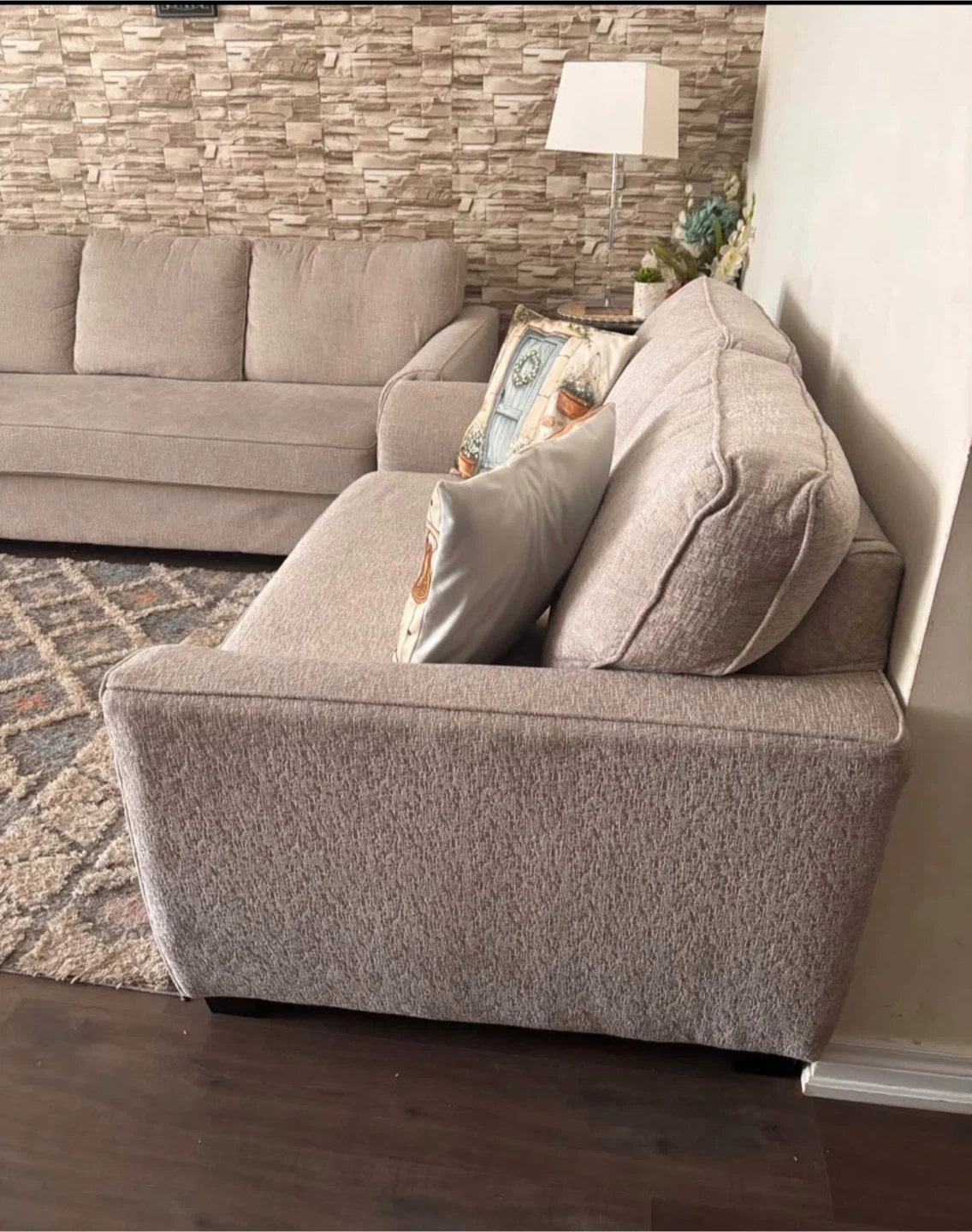 Selling a comfy light grey sofa and loveseat set. Both pieces are in great condition and would be perfect for a living room or family room. They have a neutral colour that would match any decor!from pet free home.