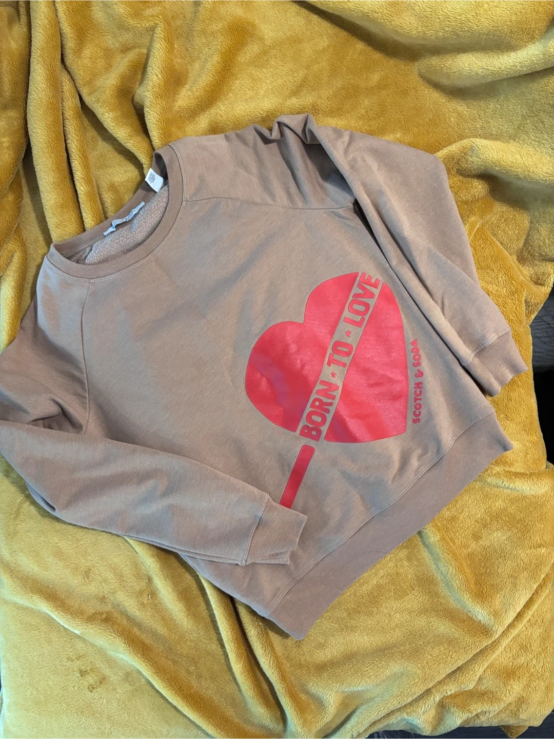 This Scotch & Soda sweatshirt features a bold "Born to Love" graphic with a large red heart. It's made of a soft, comfortable material, perfect for casual wear. A great addition to any relaxed wardrobe!