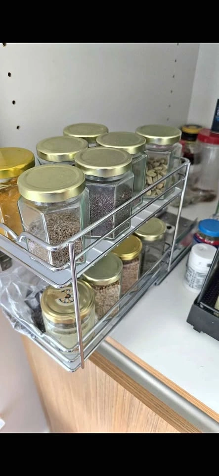 Handy 2-tier pull out spice rack. Chrome finish. Great for organizing spices in cabinet. Has smooth gliding mechanism for easy access. Pickup only in Coquitlam.